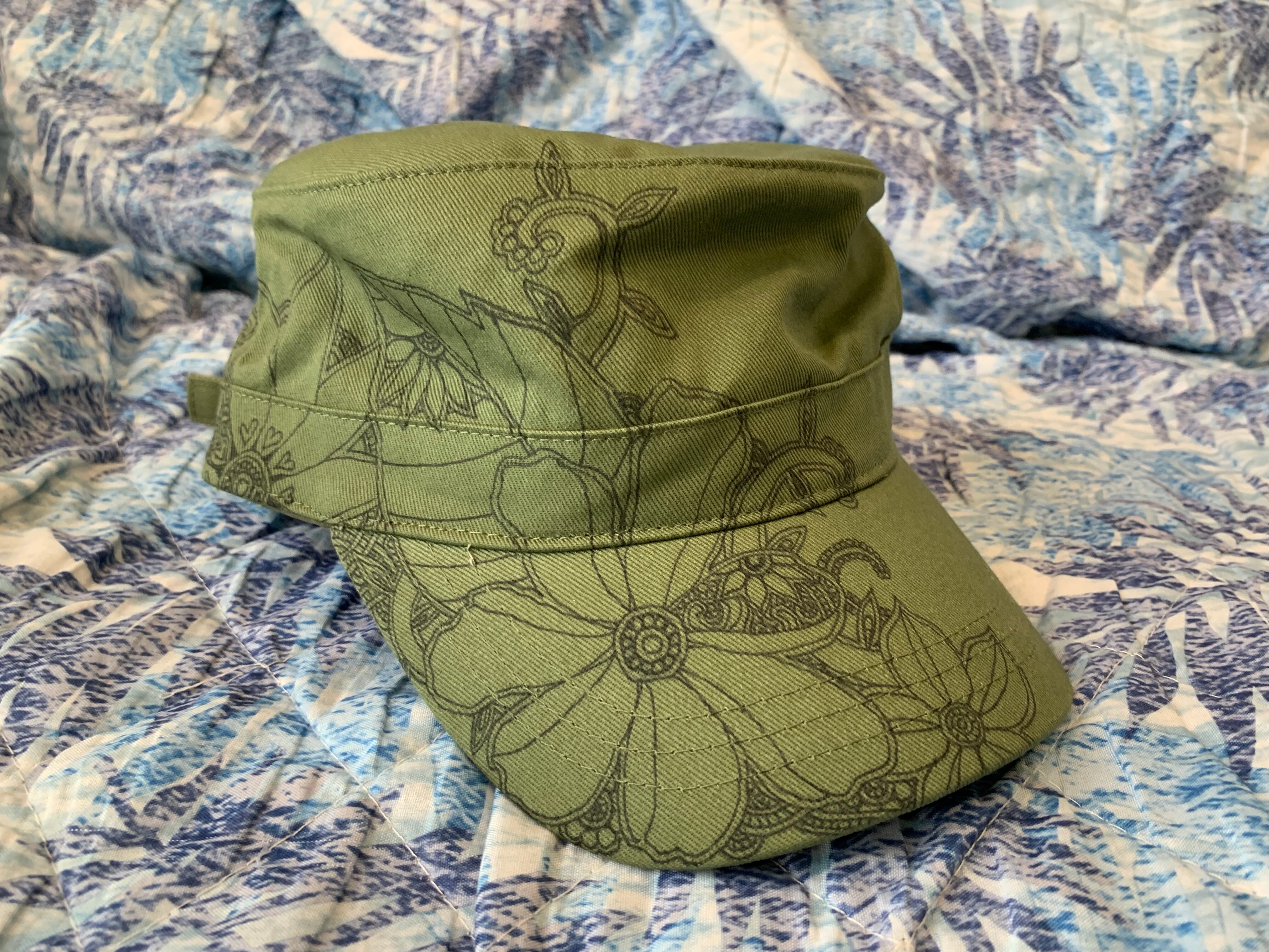 カーキ色のワークキャップの右半分に、黒の油性マーカーで大きなタングルのデザインをしました。材質は綿100%、留め具はスチールでつばの部分はポリスチレンです。頭周りは58㎝(22.8インチ)です。