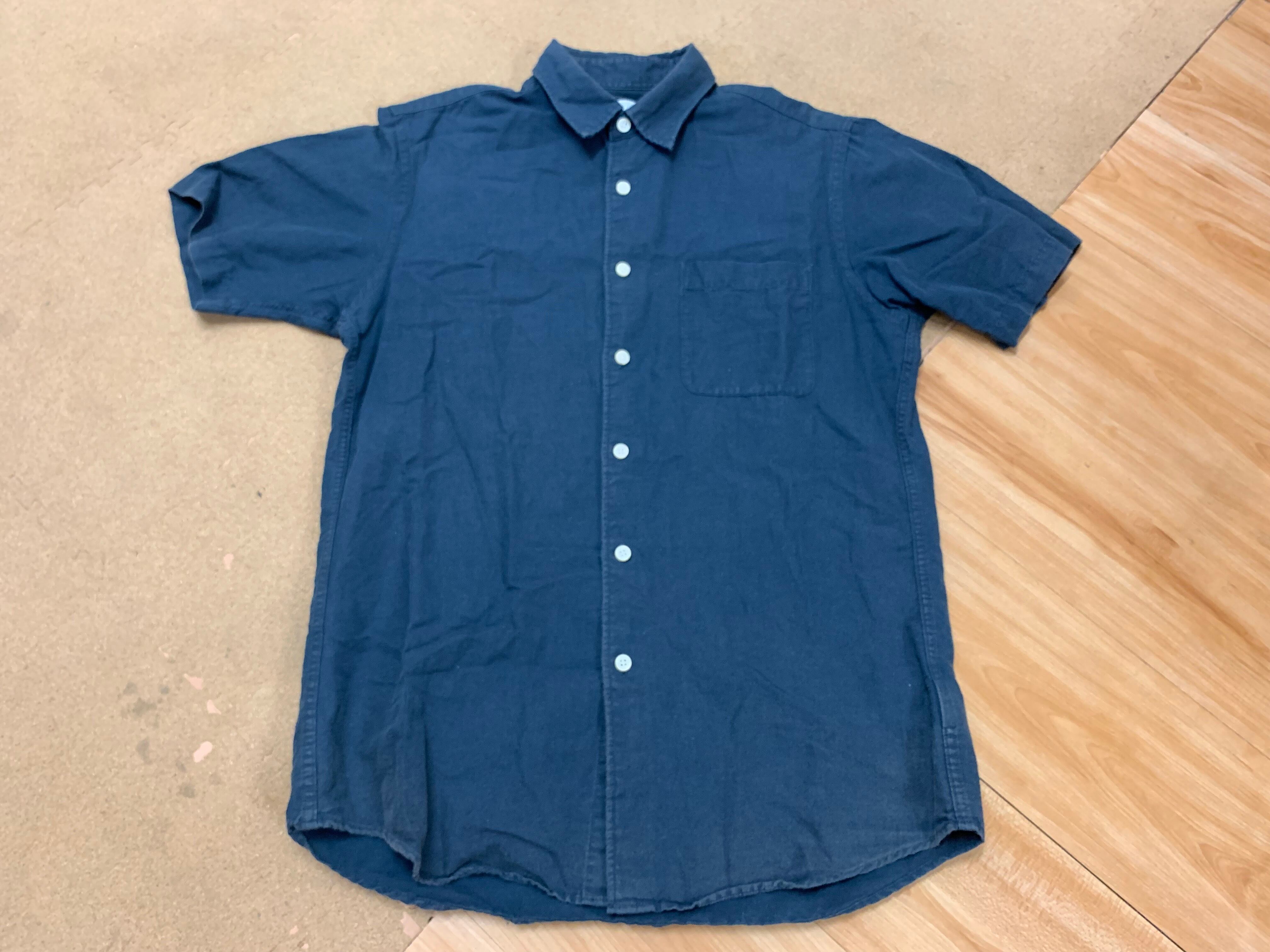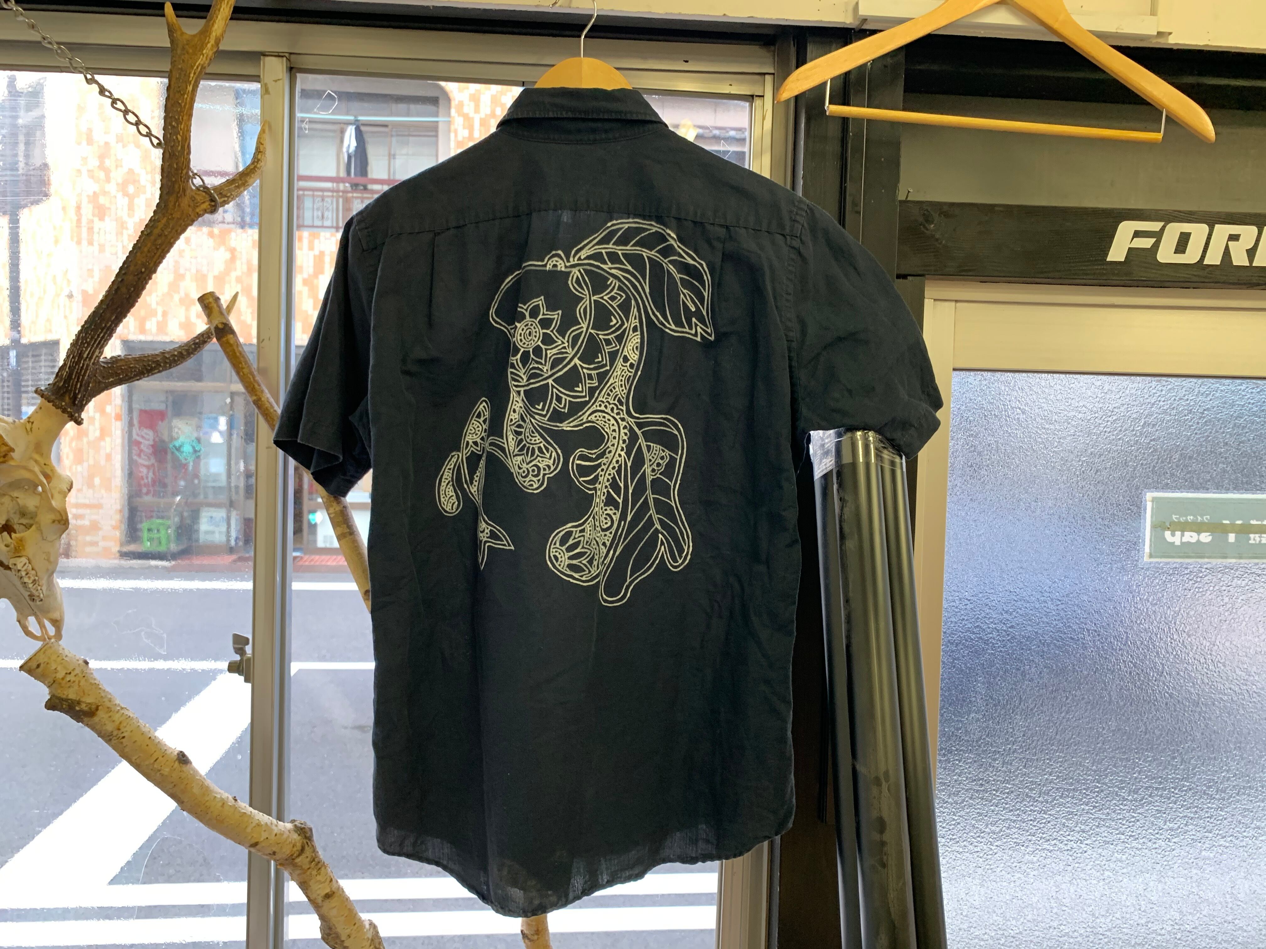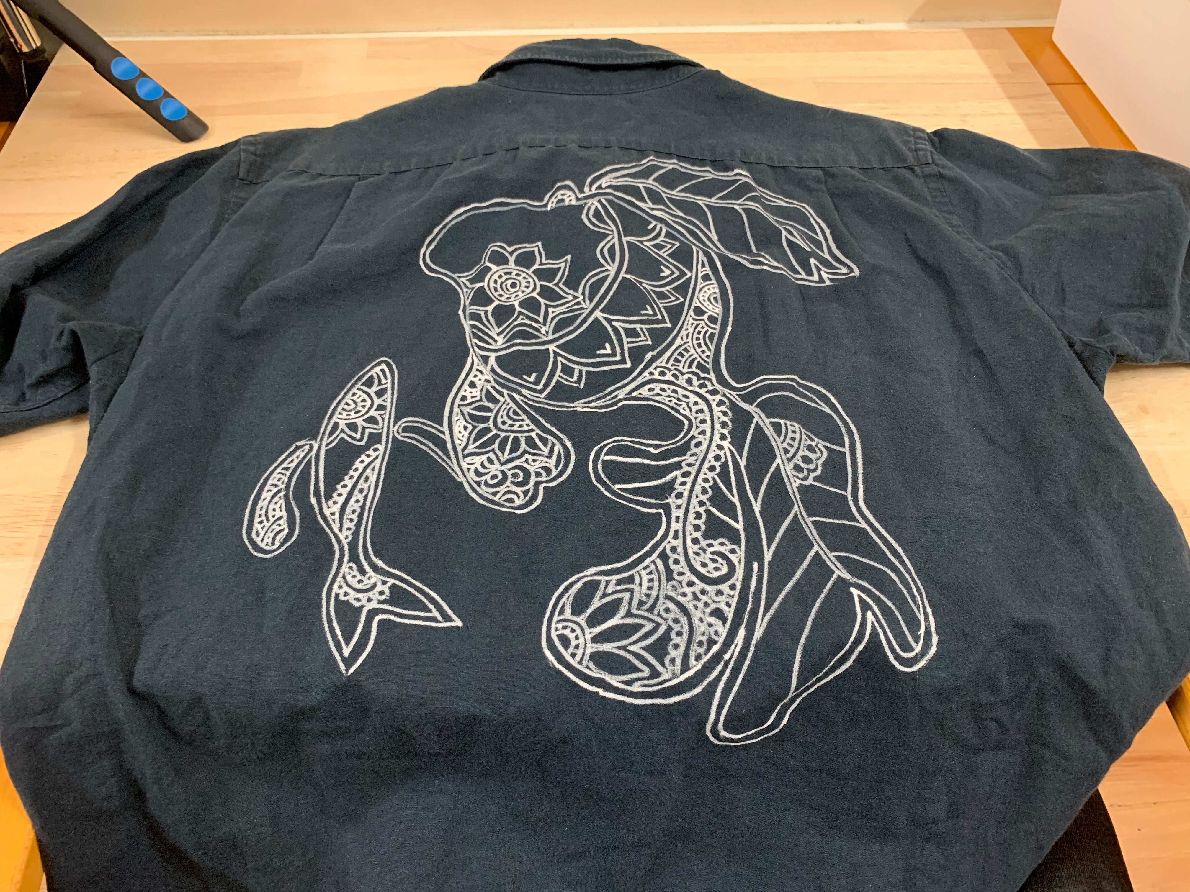 半袖の胸ポケット付シャツの背面に、白の布用マーカーで大きく”金魚”のデザインをしました。サイズはメンズM、材質は麻53%の綿47%となります。もとの商品は自分用に買っていたユニクロ