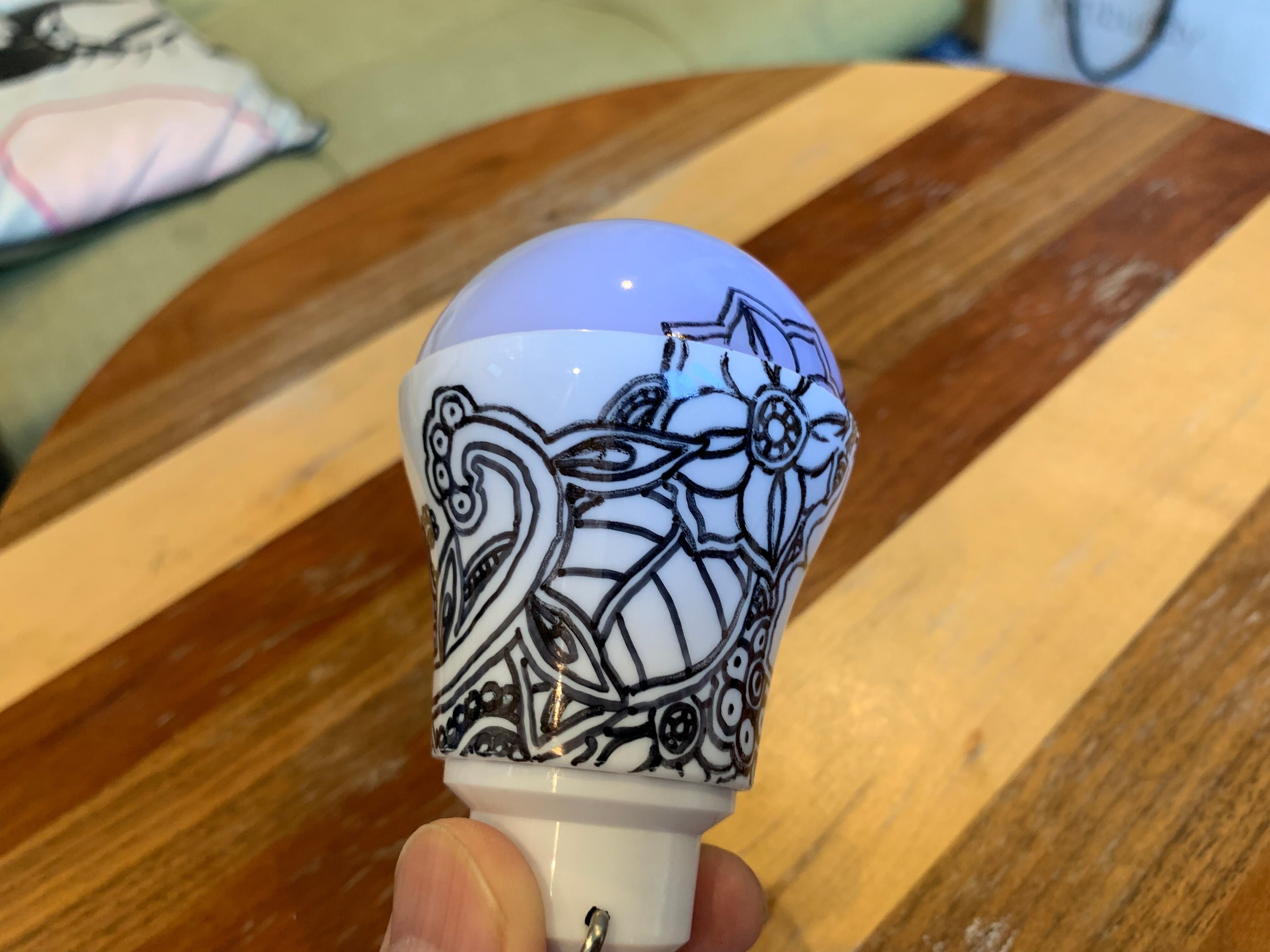 パソコンやモバイルバッテリー、コンセントにUSB用ACアダプターなどを使用する”ライト”になります。ソケットと電球の1部に黒い油性マーカーでデザインをしました。1度だけ写真のように動作確認のため点灯させました。全長は約9.5㎝で、USBコネクトはType-Aになります。