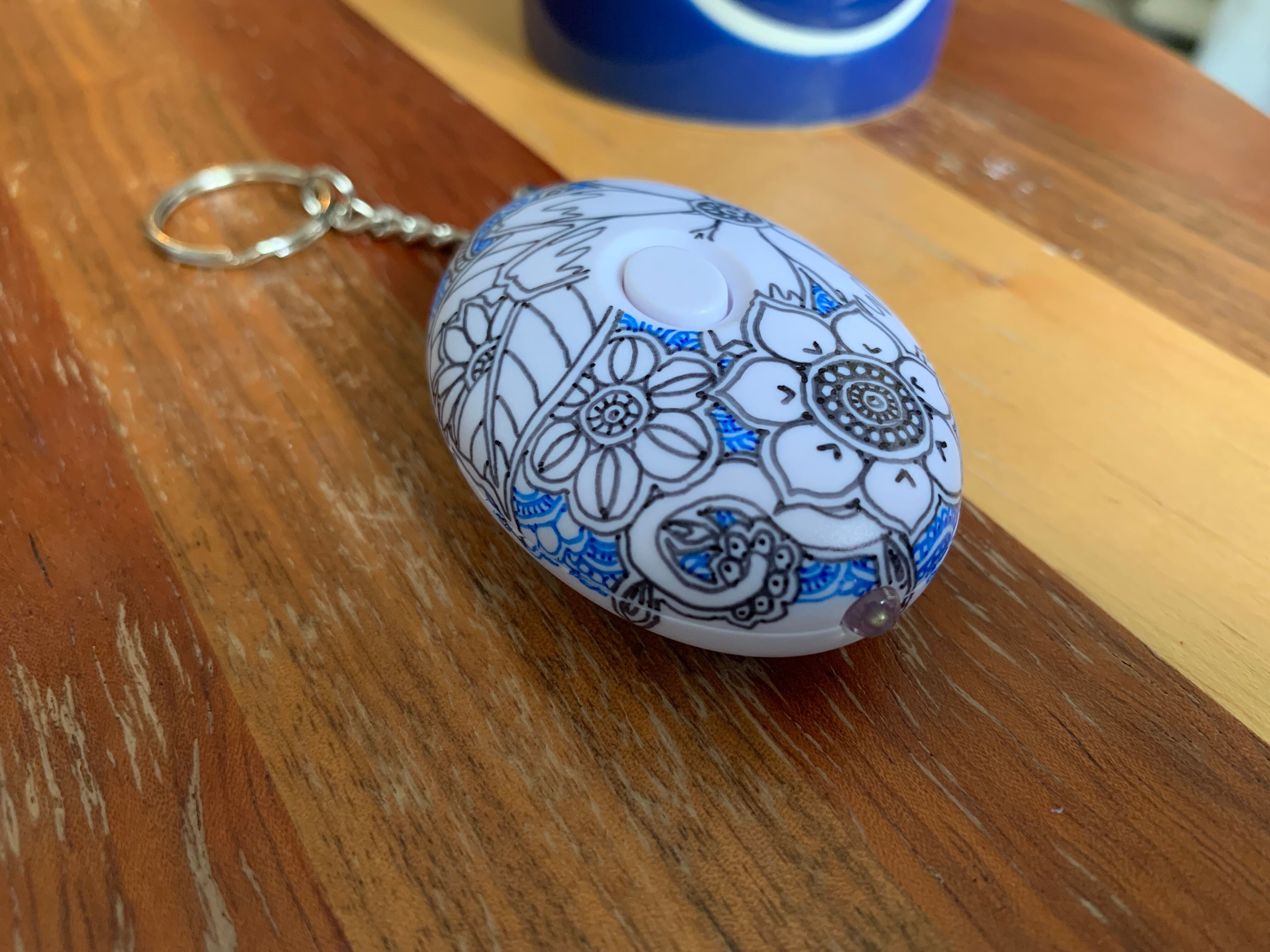子ども達の身の安全を守るための”防犯ブザー”は、なかなか可愛らしいものがなかったので、自分でデザインしてみました。娘が防犯ブザーを持って歩いている時に描いてあげたかったものです。黒と青の油性マーカーで描きました。テスト用のボタン電池は付属していますが、直ぐに電池切れになりますので、LR44のボタン電池を3個ご用意ください。