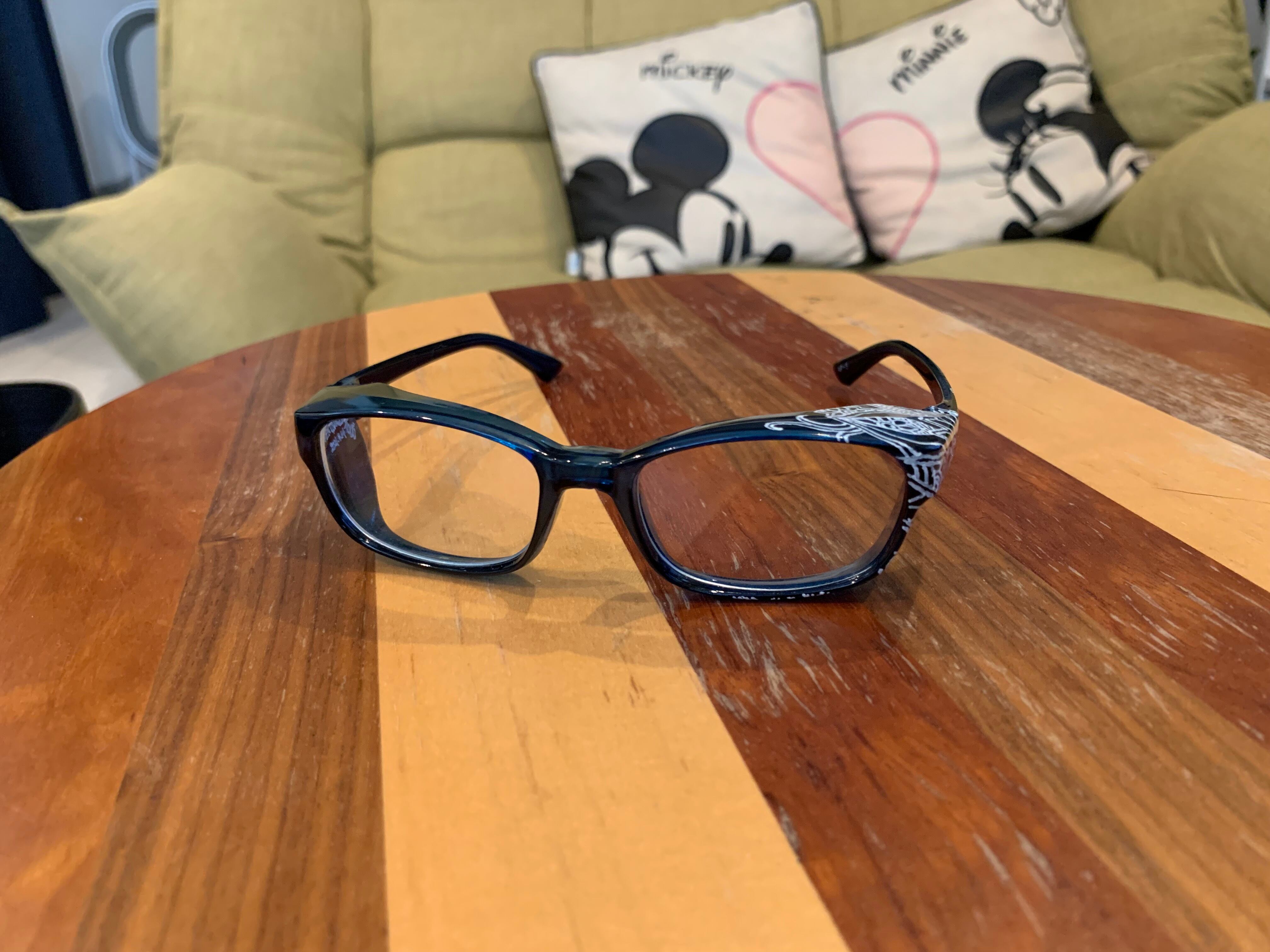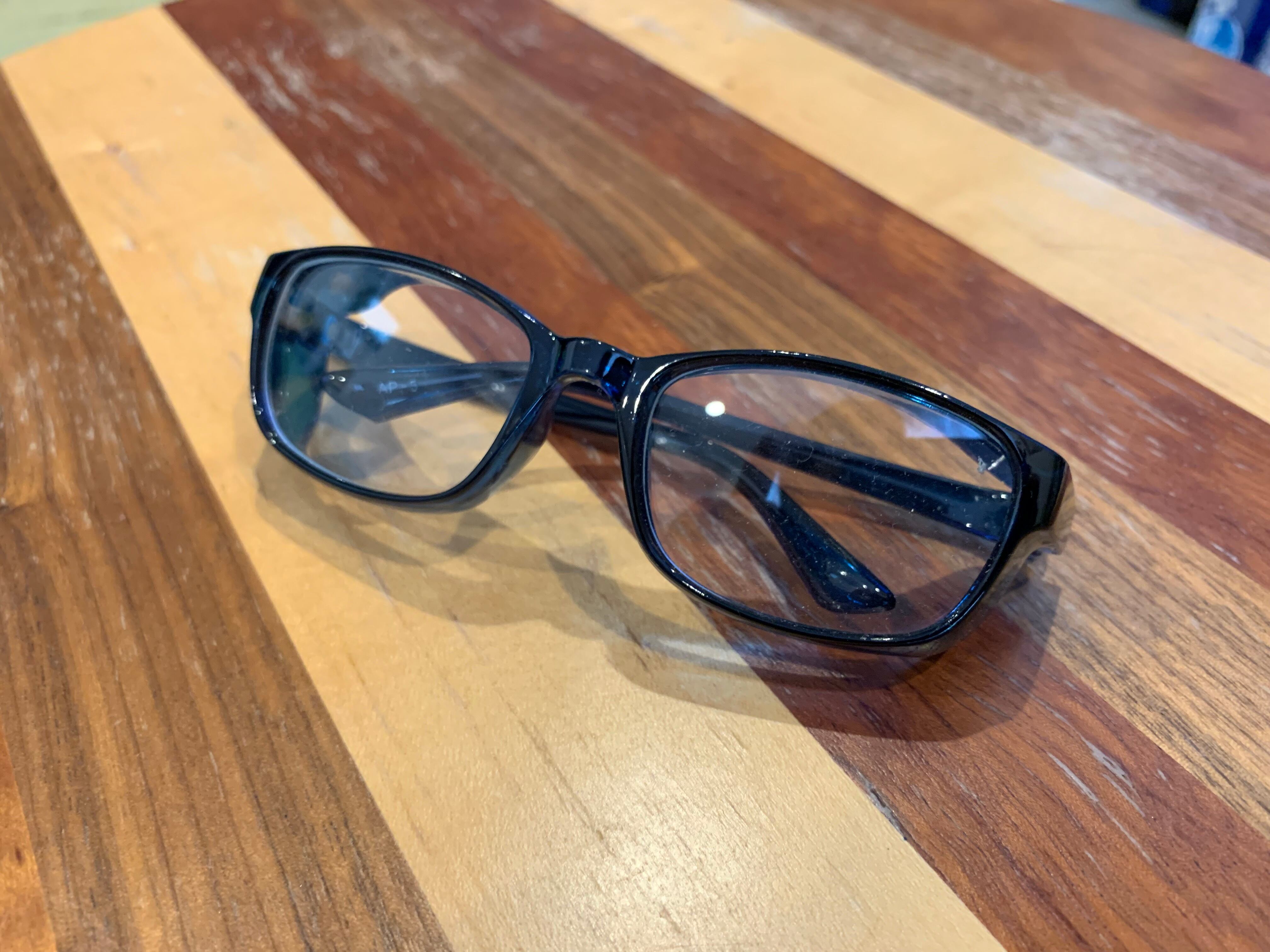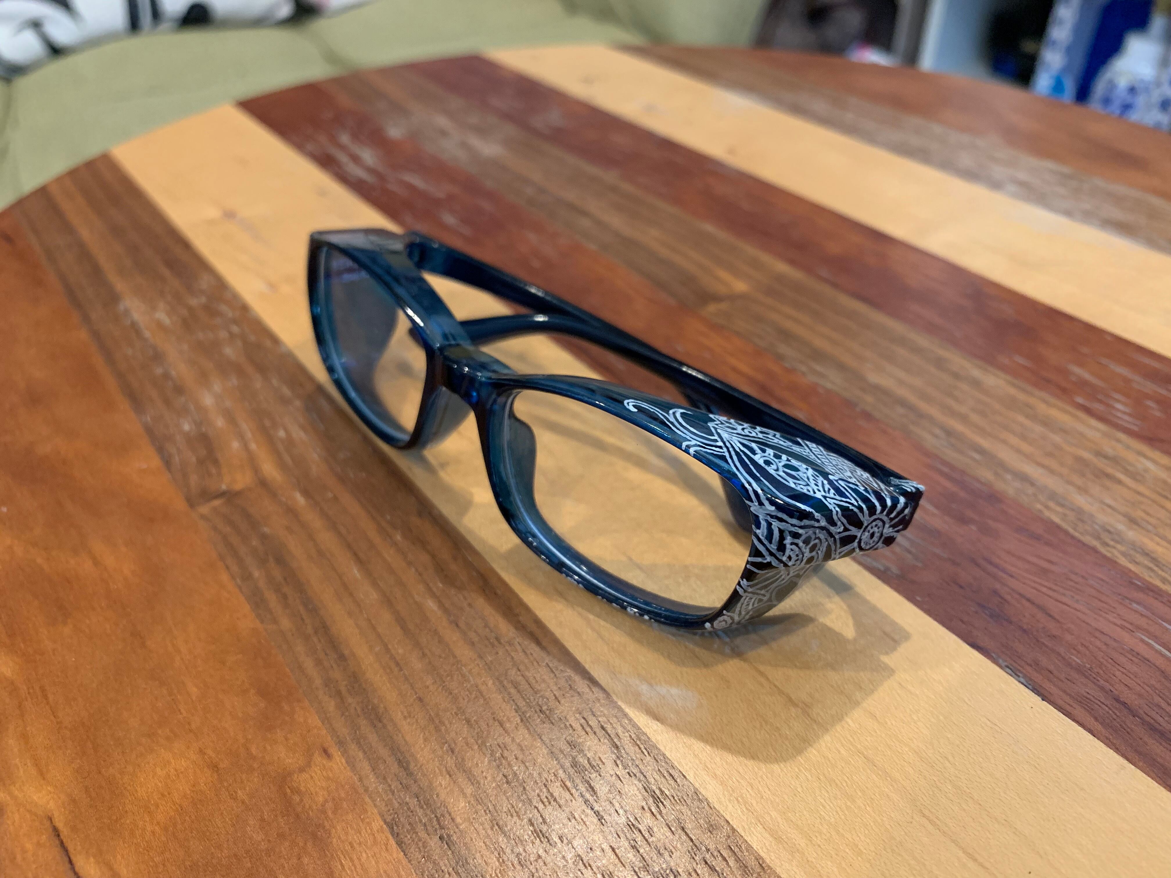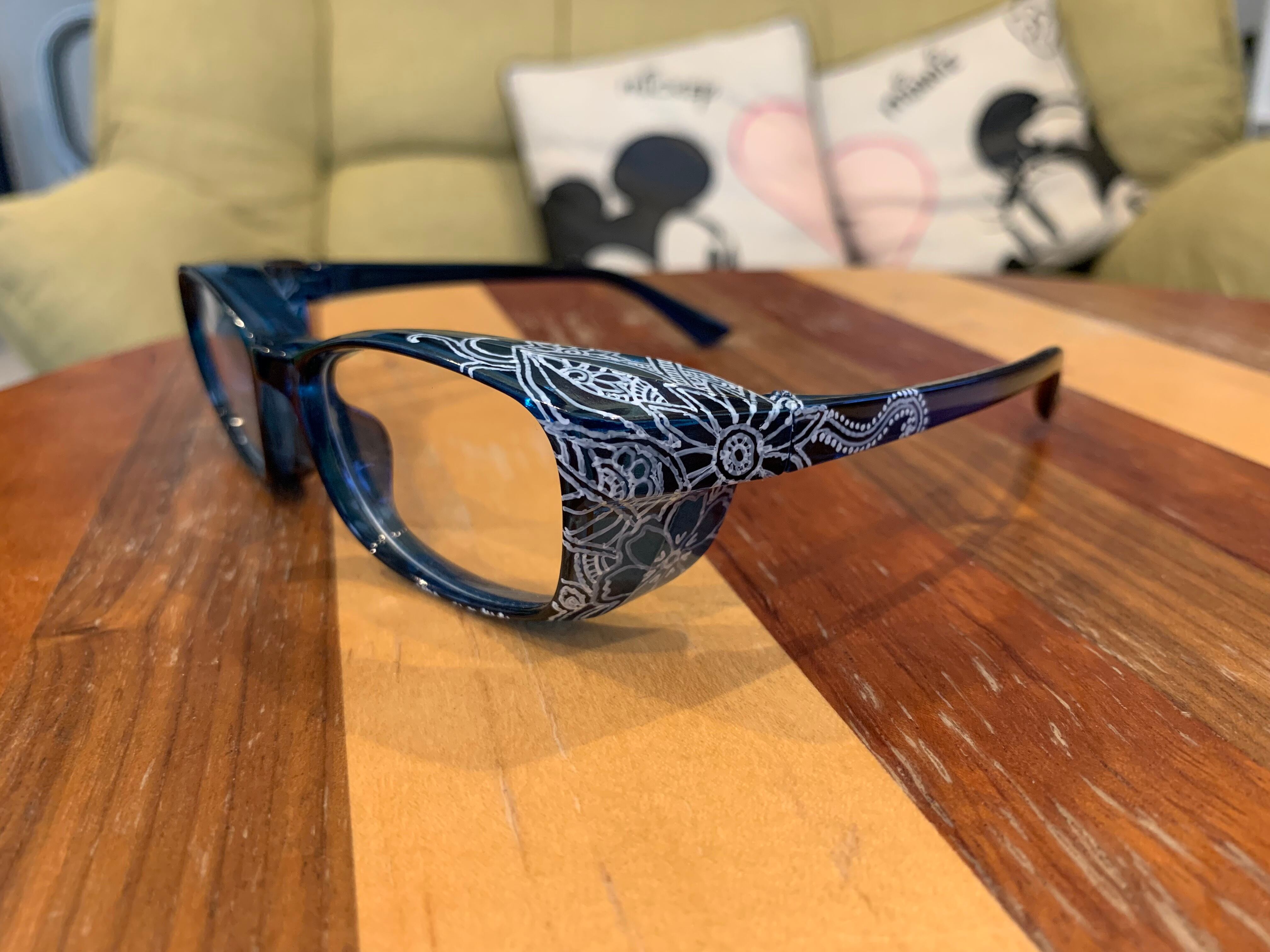 子ども用の花粉対策メガネに、白の油性マーカーでデザインをしました。キッズ用のためかなり小さいサイズ(レンズまわりフレームの長さが約13.5㎝)なので、使用できるのは小学校中学年程度までとなります。プラスティックレンズなので、落としても安心です。