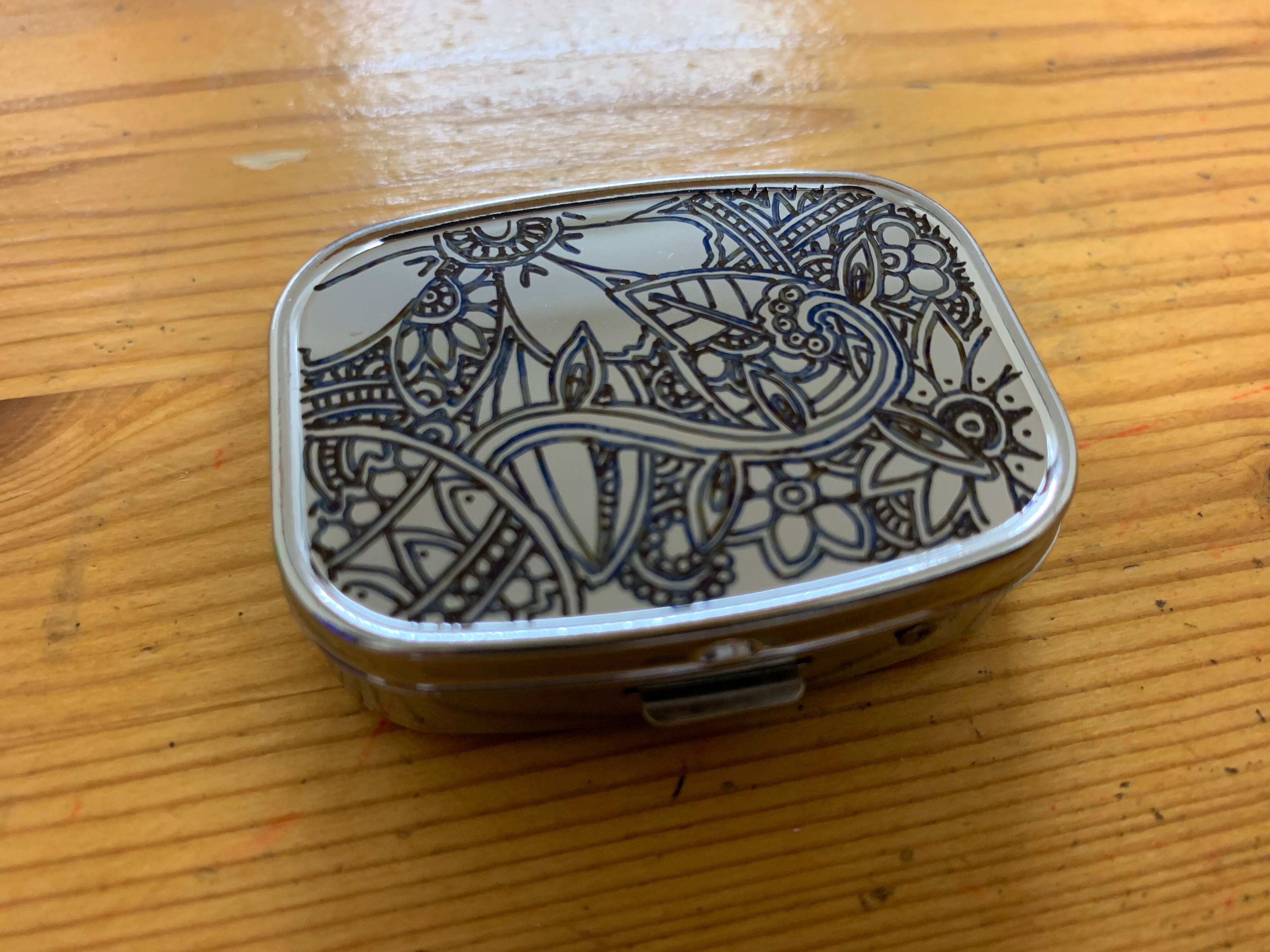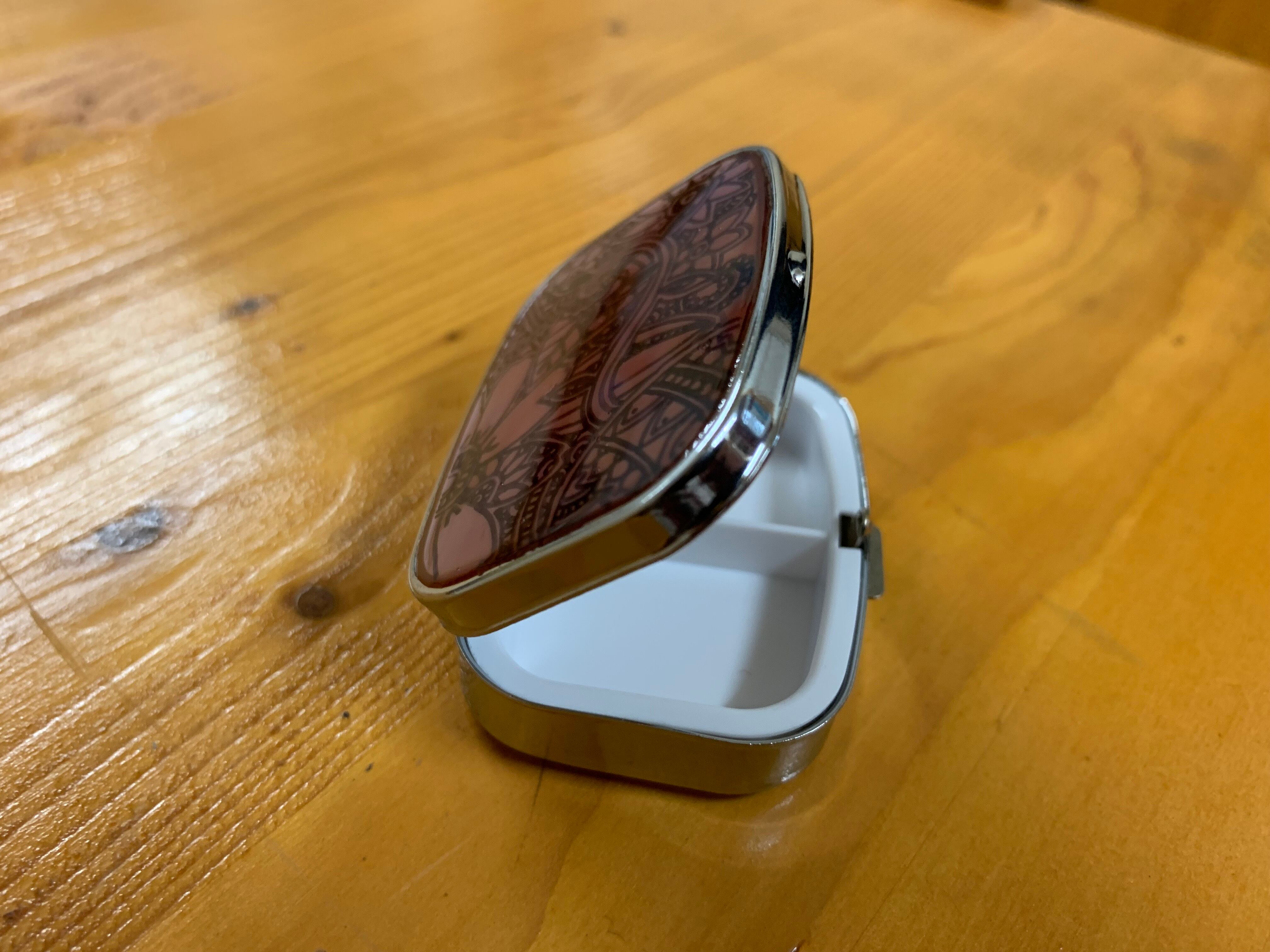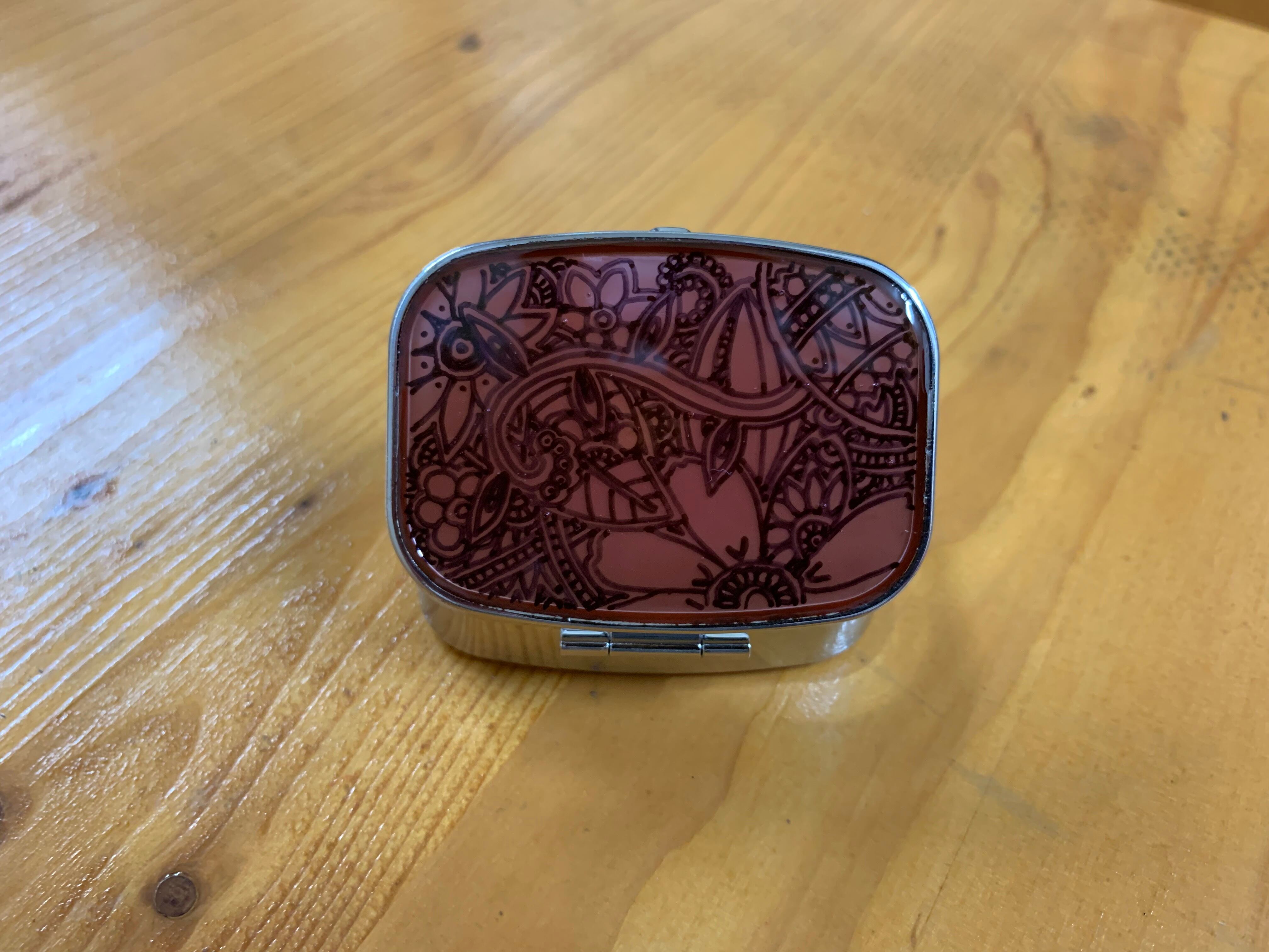 速乾性のクリアレジンを使用した長方形の”小物入れ”です。先に黒い油性マーカーでデザインをし、その上に赤クリアのレジンをかけて固めたものです。薬などを入れる小物入れです。サイズは約4㎝×5.5㎝×2㎝になります。