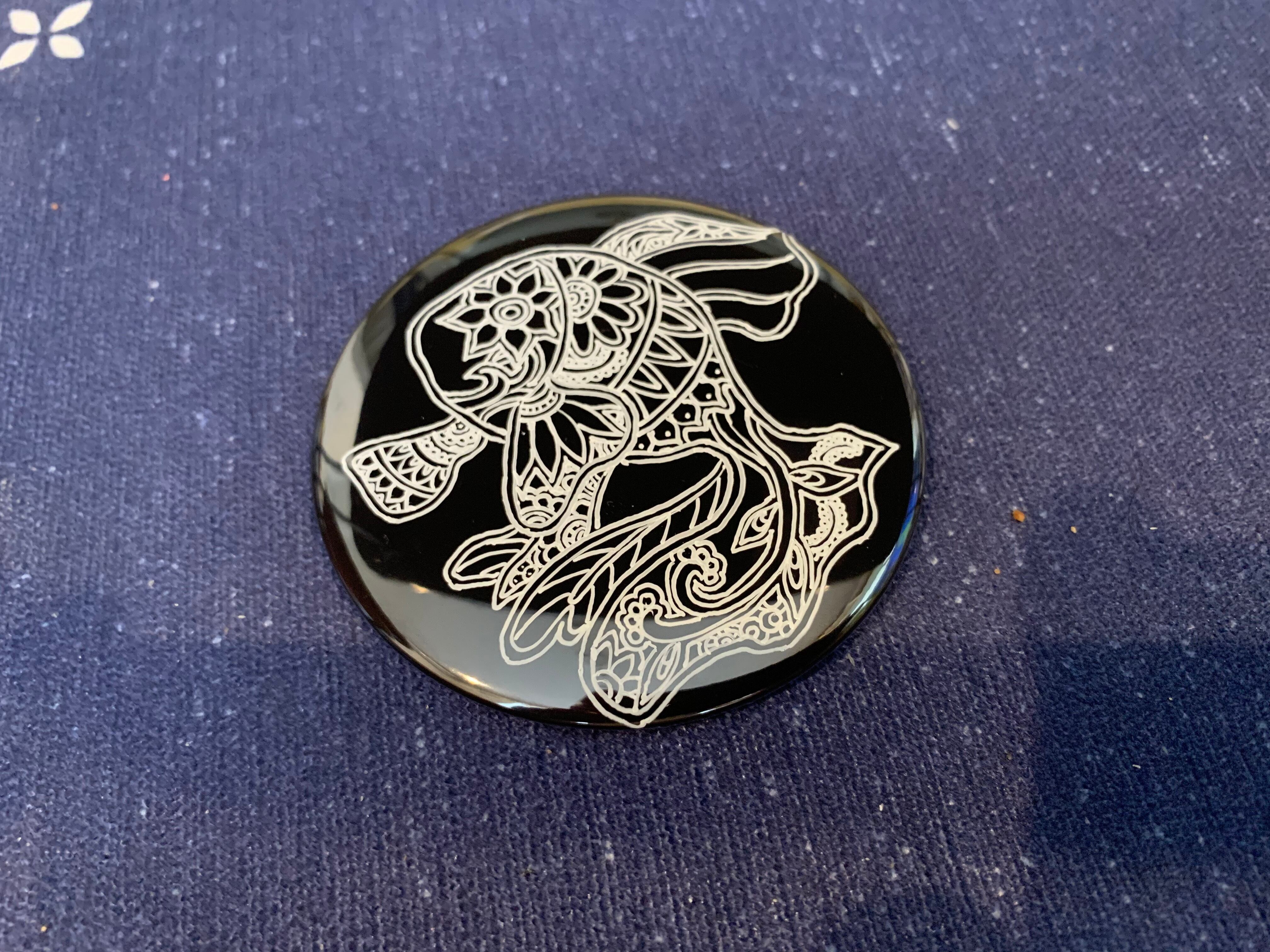 黒い缶バッチに白の油性マーカーで”金魚”のデザインをしました。ちなみに縁起の良い”登り金魚”になります。限られた空間でデザインをしていますので、バランスよく描くのは難しいです。サイズ(大)は、直径7.5㎝となります。