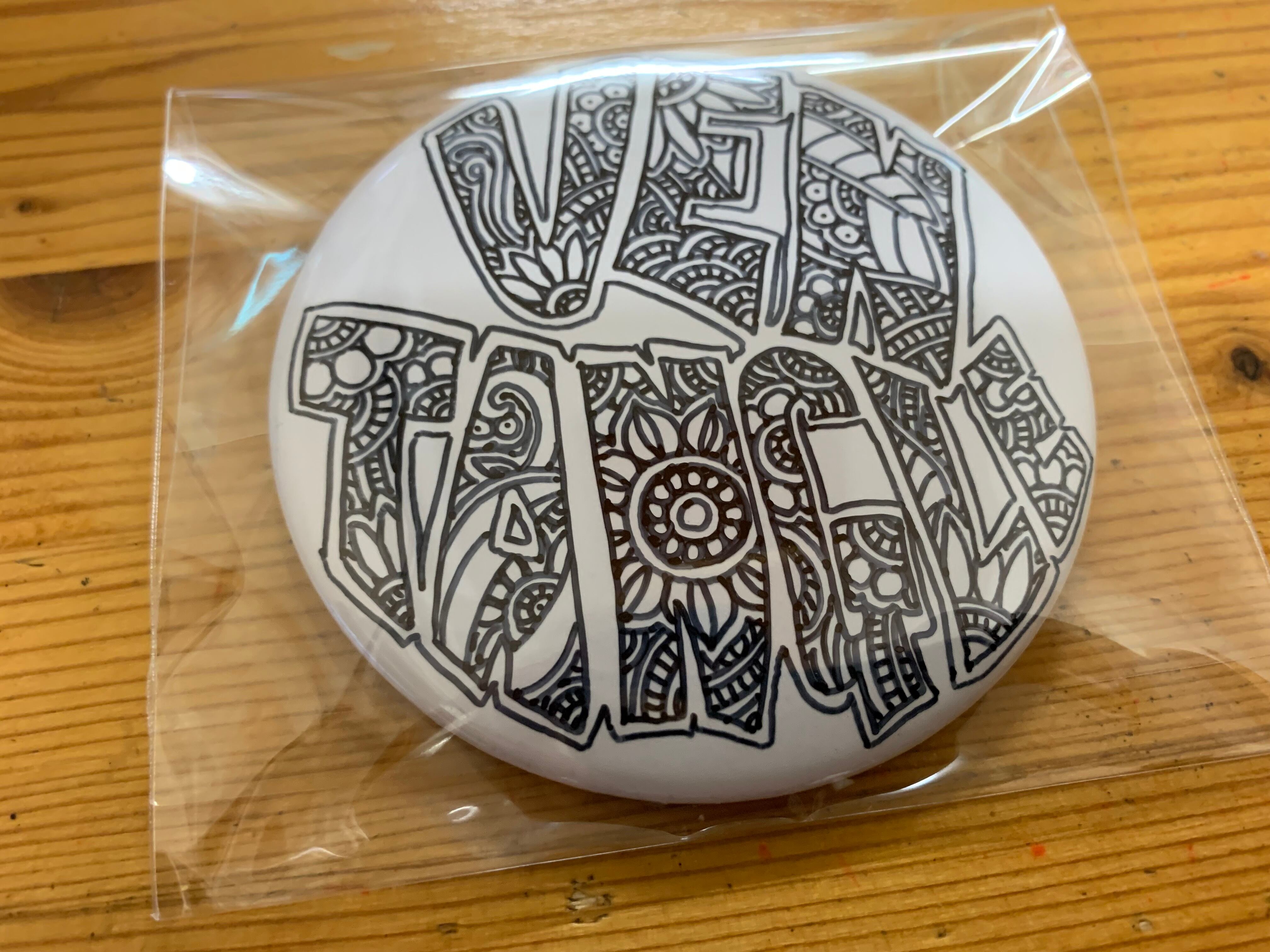 白い缶バッチに黒の油性マーカーで”VENTANGLE”のデザインをしました。ブランド名をそのまま缶バッチにしたので珍しい作品になります。限られた空間でデザインをしていますので、バランスよく描くのは難しいです。サイズ(大)は、直径7.5㎝となります。
