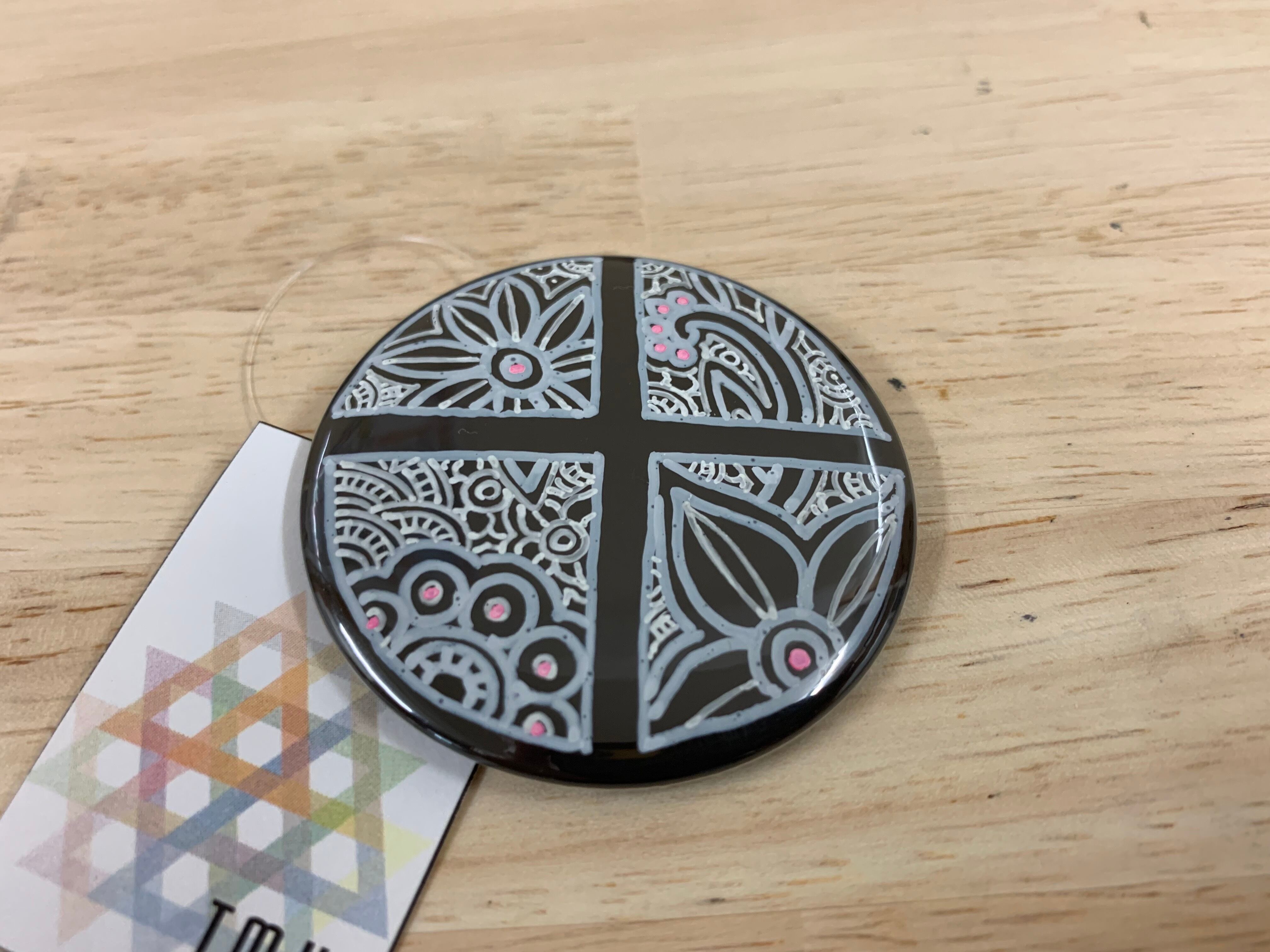 黒い缶バッチに白の油性マーカーで”十字窓”のデザインをし、ピンクの油性マーカーでアクセントをつけました。限られた空間でデザインをしていますので、バランスよく描くのは難しいです。サイズ(小)は、直径5.5㎝となります。