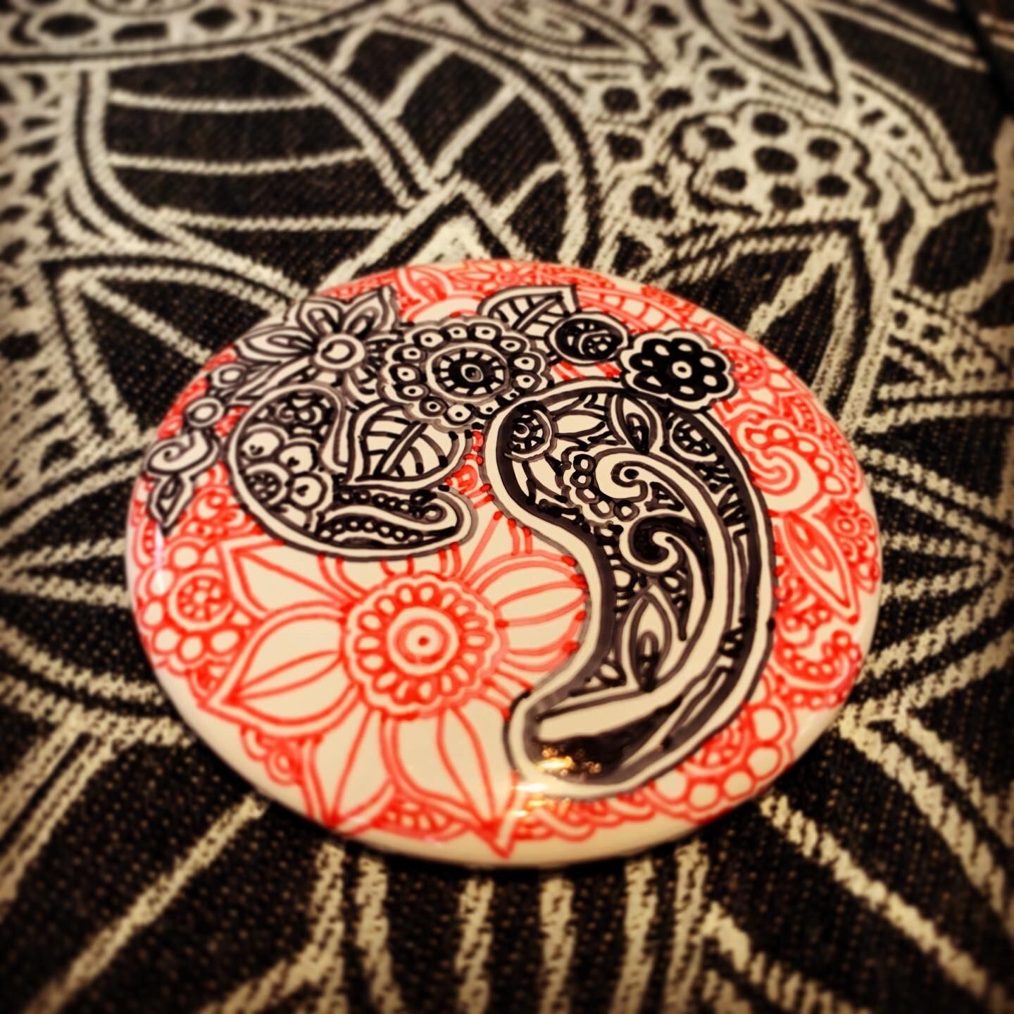 白い缶バッチに黒と赤の油性マーカーで”足あと”のデザインをしました。2色にしたことで黒い足あとが浮き出るように見える作品です。限られた空間でデザインをしていますので、バランスよく描くのは難しいです。サイズ(小)は、直径5.5㎝となります。