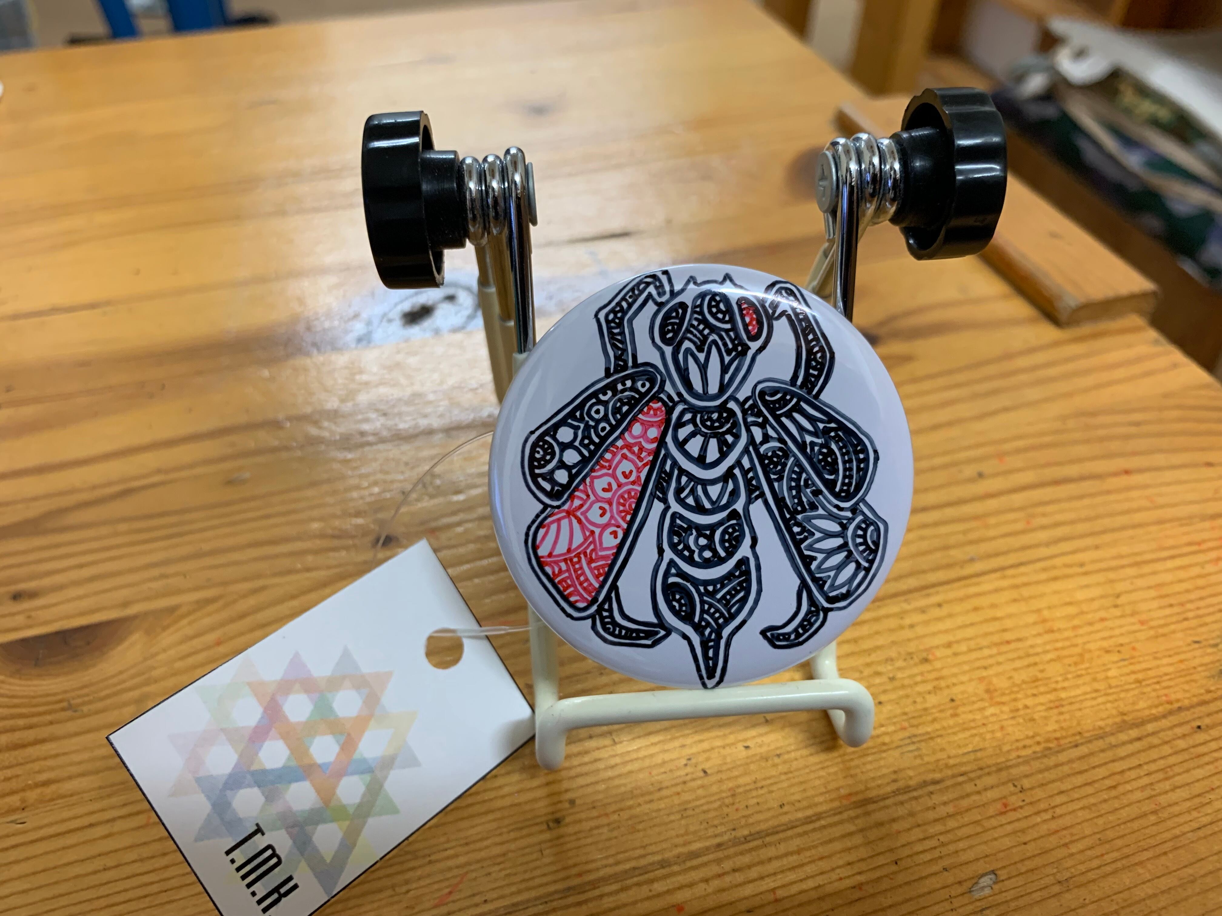白い缶バッチに黒と赤の油性マーカーで”蜂”のデザインをしました。限られた空間でデザインをしていますので、バランスよく描くのは難しいです。サイズ(小)は、直径5.5㎝となります。