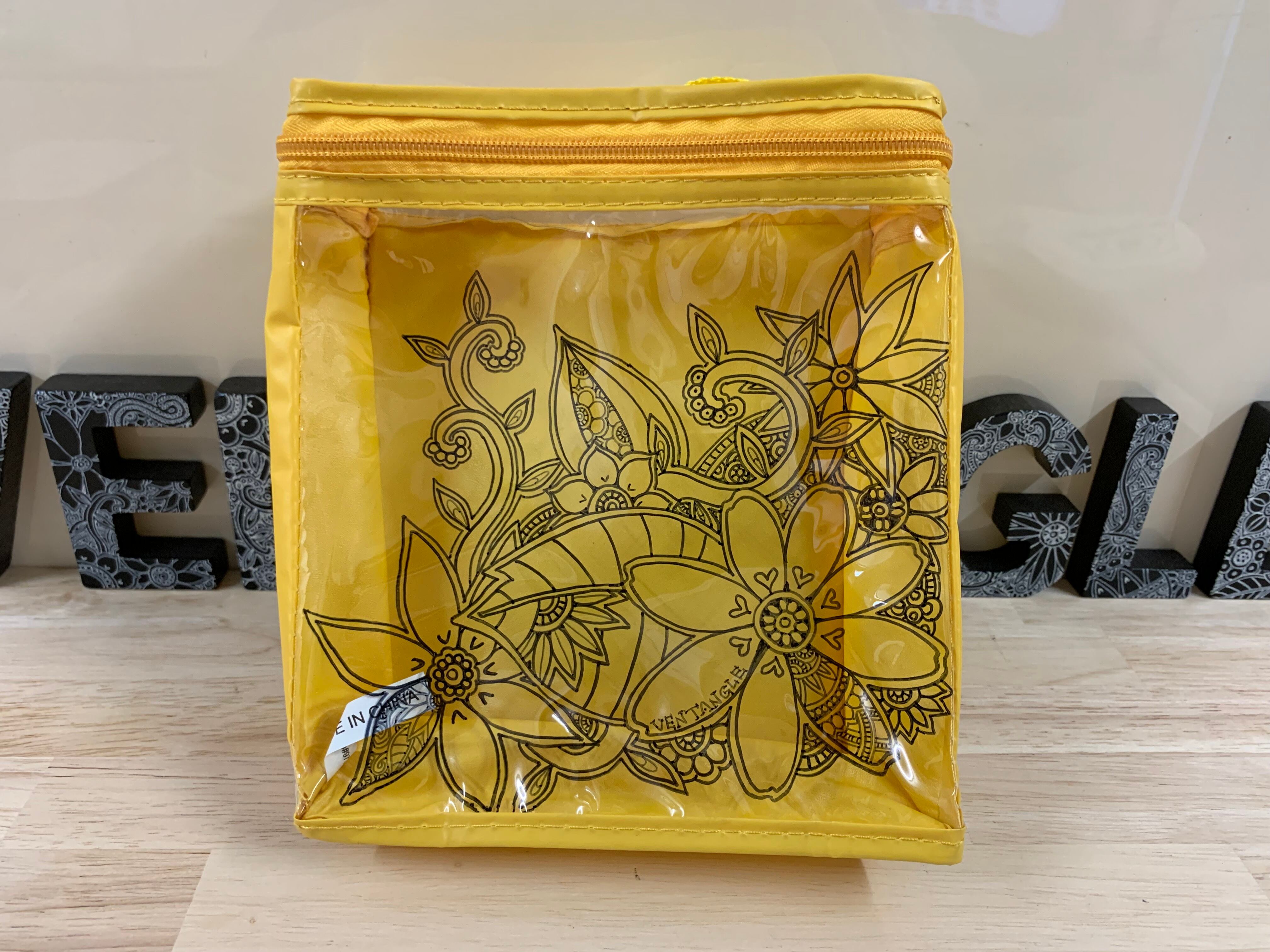 ABCストアーでコーヒー豆などを入れている黄色い袋に、黒の油性マーカーでデザインしたものです。チャックがついているの、お弁当入れなどにも利用できそうです。サイズは約20㎝×17㎝×6㎝となります。