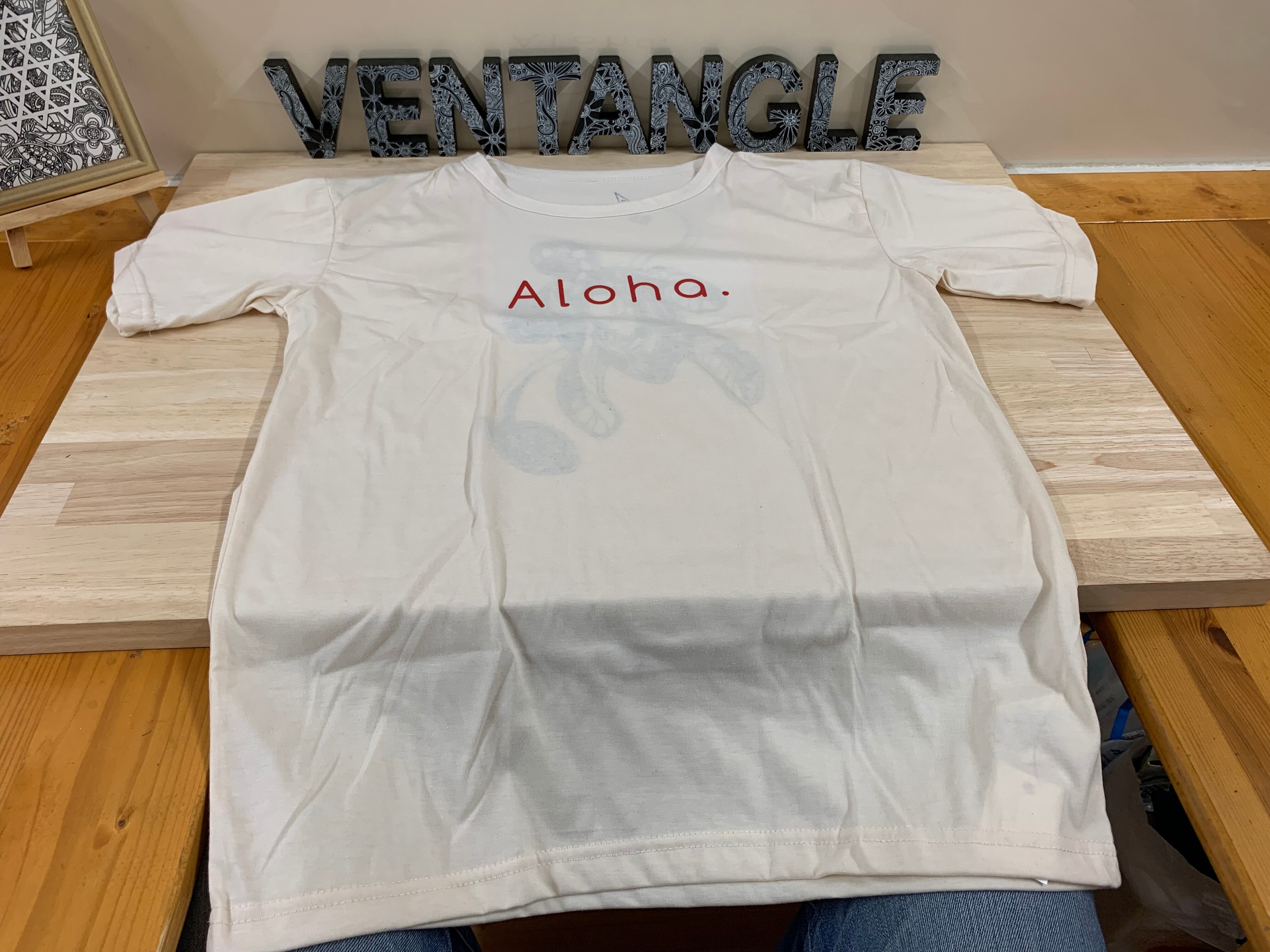 ”Aloha.”と胸に描かれているTシャツのバックプリントとして、黒の油性マーカーで大きく亀(ホヌ)をデザインしたものです。もとはダイソー商品になります。サイズは女性用のLサイズで、バストは86~94㎝となります。