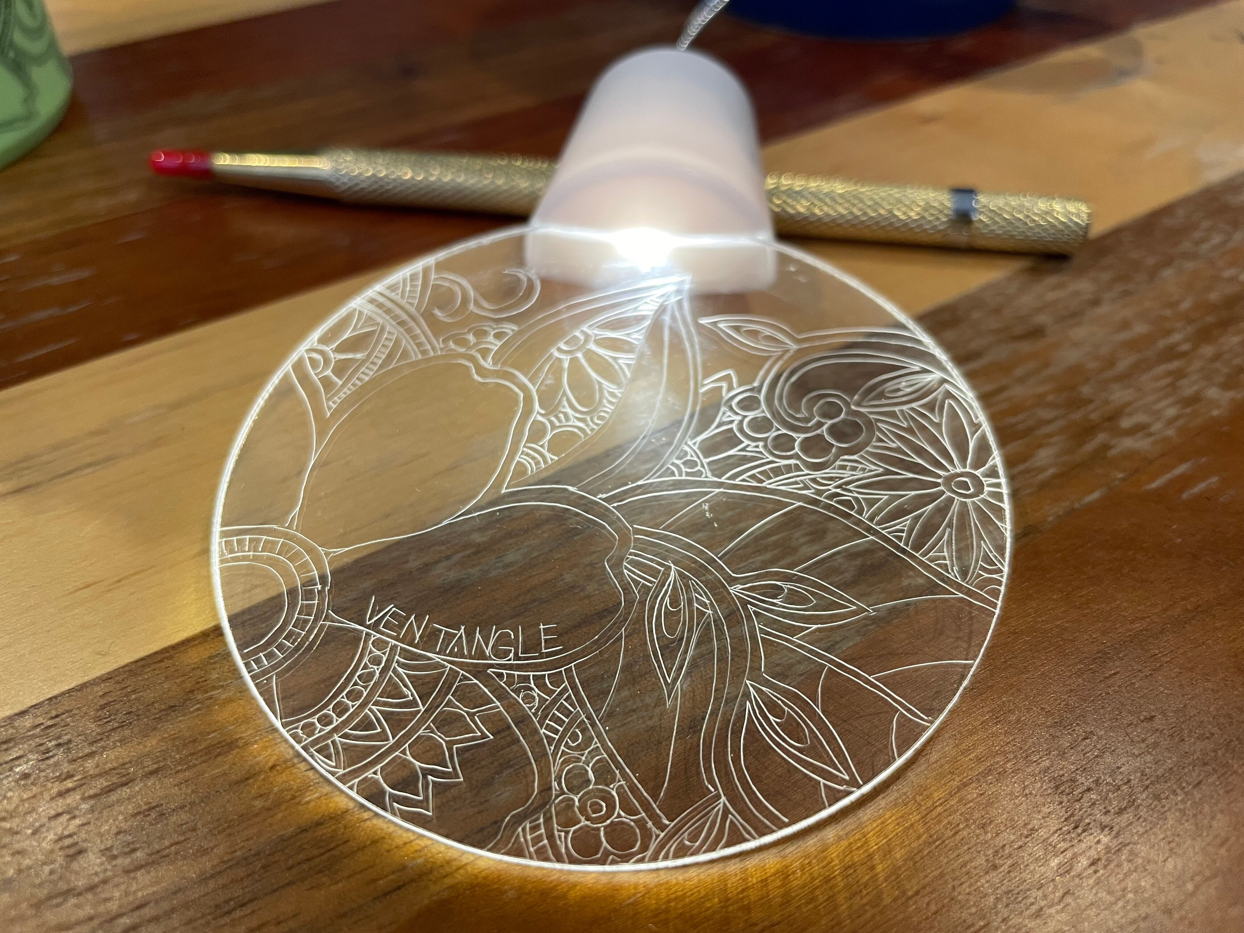 油性マーカーによるデザインではありませんが、無地のアクリルライトに先の尖った特殊な道具でスクラッチデザインをしました。LEDライトをつけると、引っ搔いて作ったデザインの部分が光り、写真のようにとても綺麗になります。LED色はウォームホワイト、本体サイズは約11.5㎝×8㎝となります。電池はコイン型リチウム電池(CR2032)を1個使用します。新品の電池を使用して連続点灯時間は約24時間となります。テスト用の予備電池は付属しています。