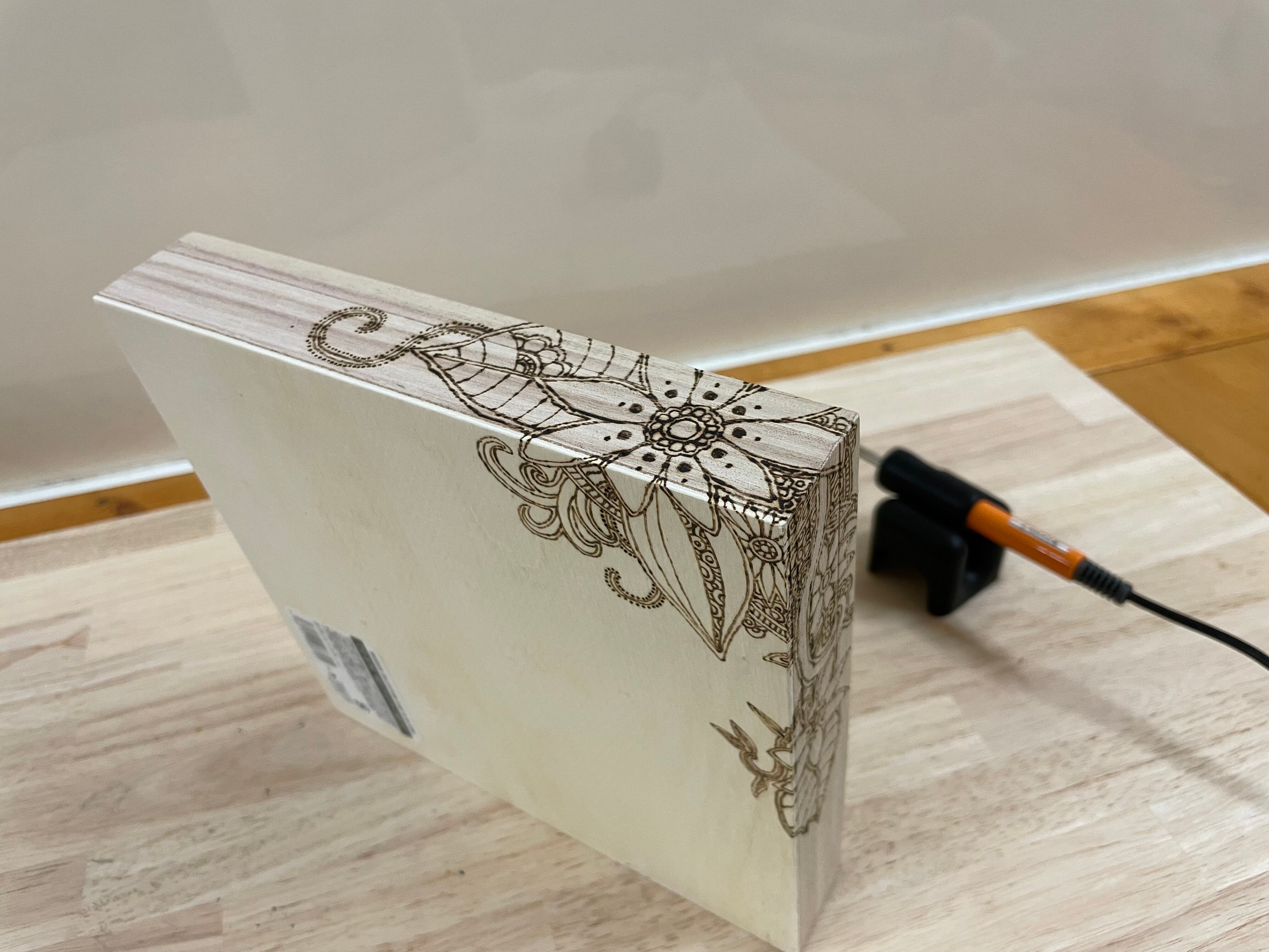 天然木を使用した「木製コレクションケース(薄型)」に、ウッドバーニングでデザインをしたものです。開閉部分は磁石でとめるタイプなので、とてもすっきりとしています。縦横は約20㎝、高さは約3.5㎝です。