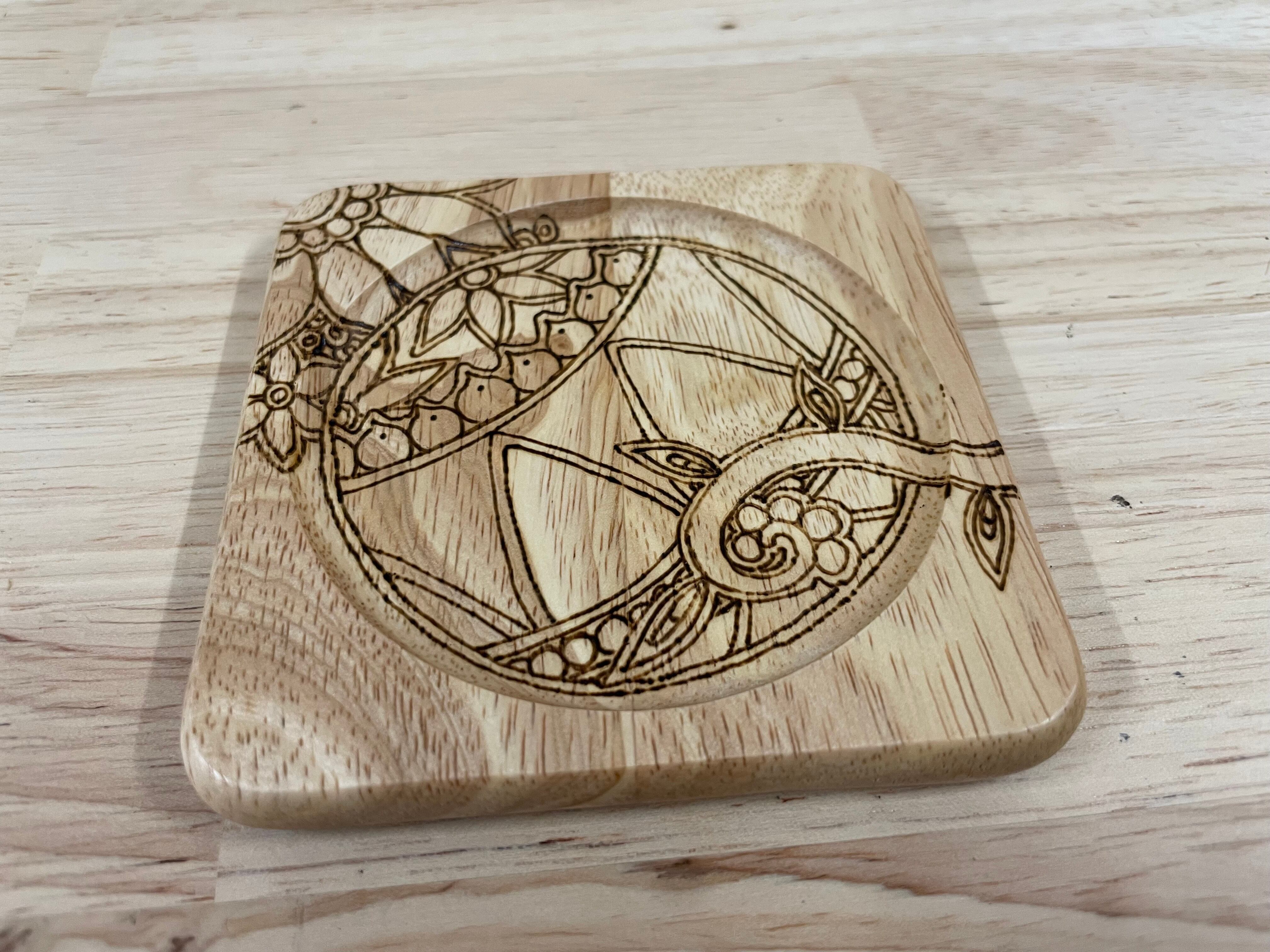 木製コースターにウッドバーニングでデザインをしました。それぞれ違うデザインですが、2枚を揃えると、デザインはつながっています。ぜひ大切な人とお使いください。サイズは約9㎝×9㎝です。