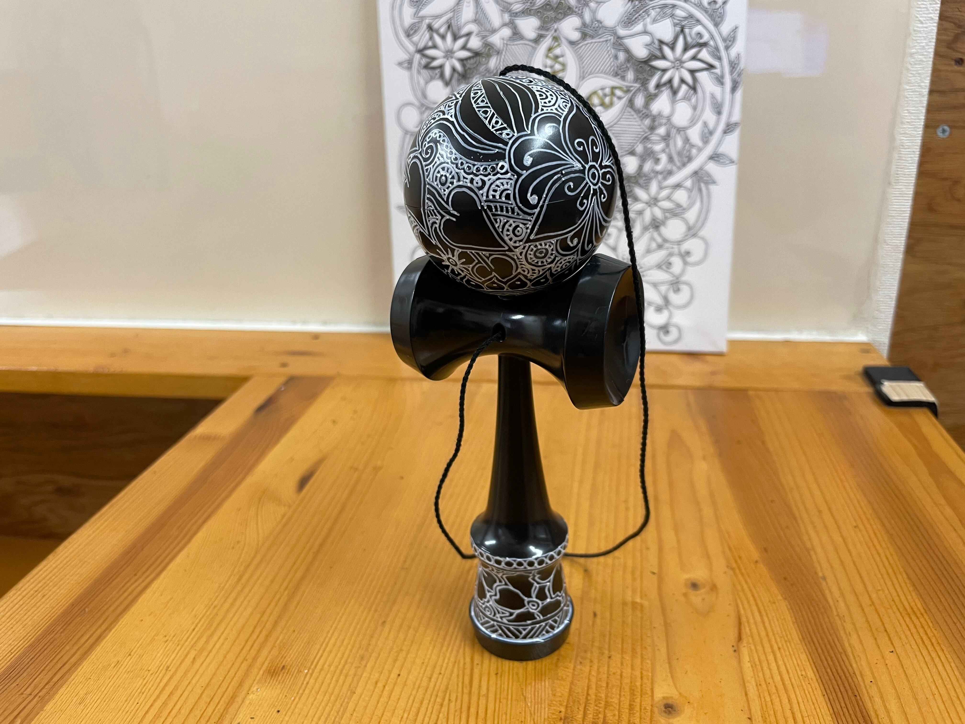 昔懐かしの玩具”けん玉(黒)”の、玉の部分と持ち手の一部を、白の油性マーカーでデザインした珍しいものです。球体にデザインをするのはとても難しいのですが、初代の作品が売切れとなった後に要望が多かったので〝黒×白〟という新しいデザインで描きました。