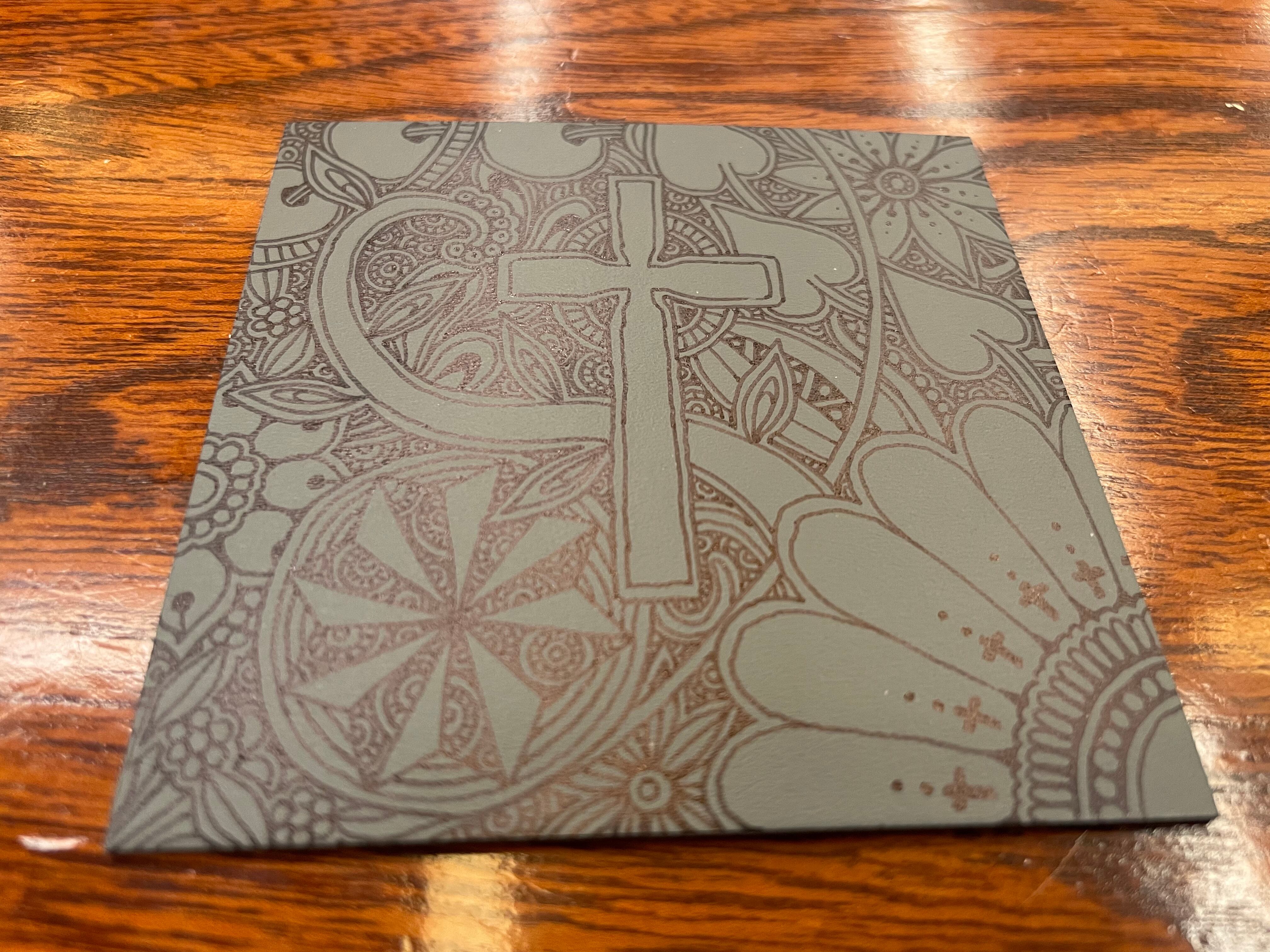耐熱性、耐水性の特殊紙PASCOに、マッキーを使用して下描きなしの1発勝負で描いたデザインコースターです。今回のテーマは〝クロス〟です。同封している滑り止めを付けてコースターとして使っても良し、そのまま額などに入れて作品として飾るのも良いです。