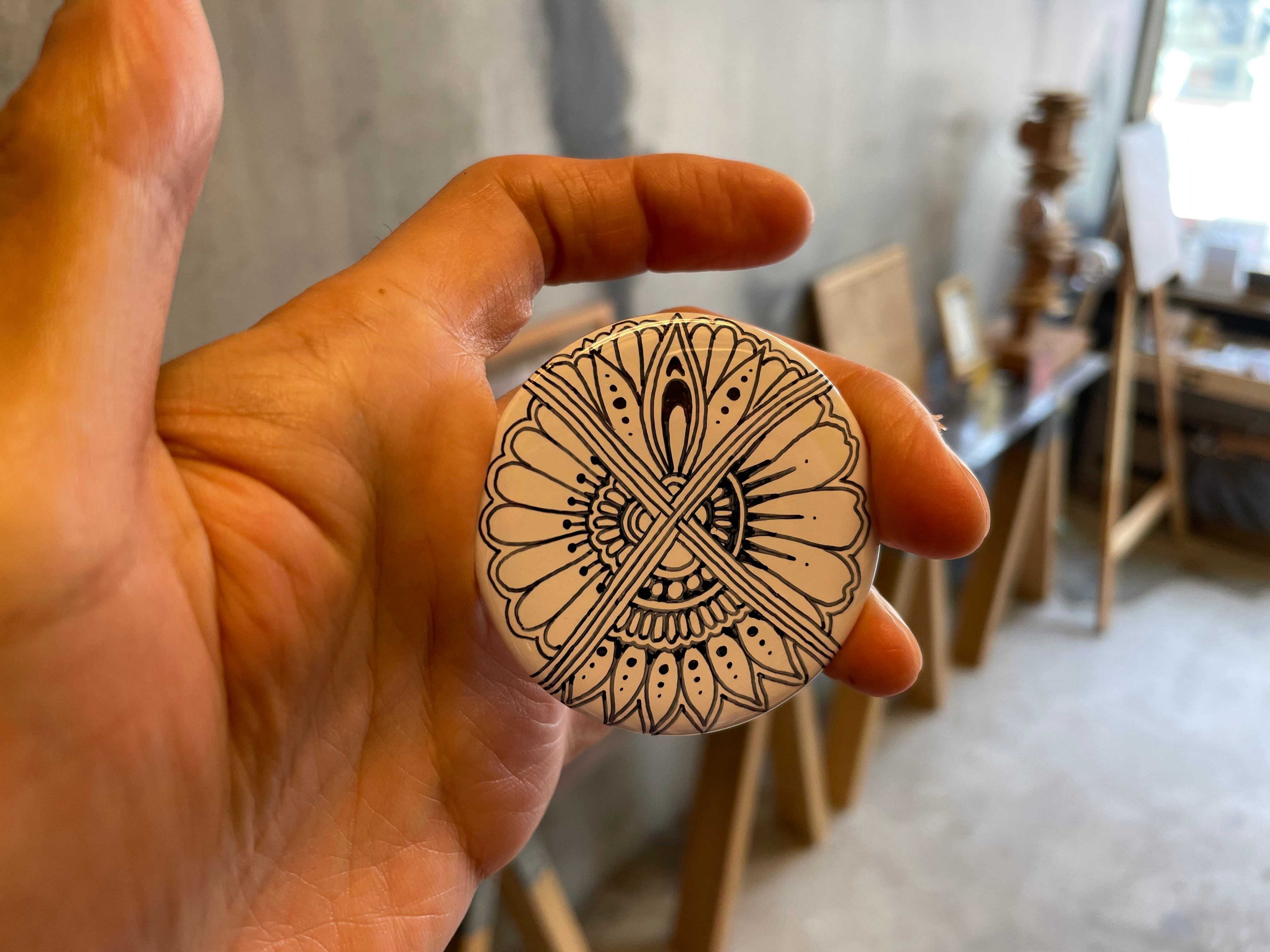 白い缶バッチに黒の油性マーカーで”十字窓”のデザインをしました。同じ華をモチーフしつつ、それぞれの空間で異なる面白さを表現しています。サイズ(小)は、直径5.5㎝となります。