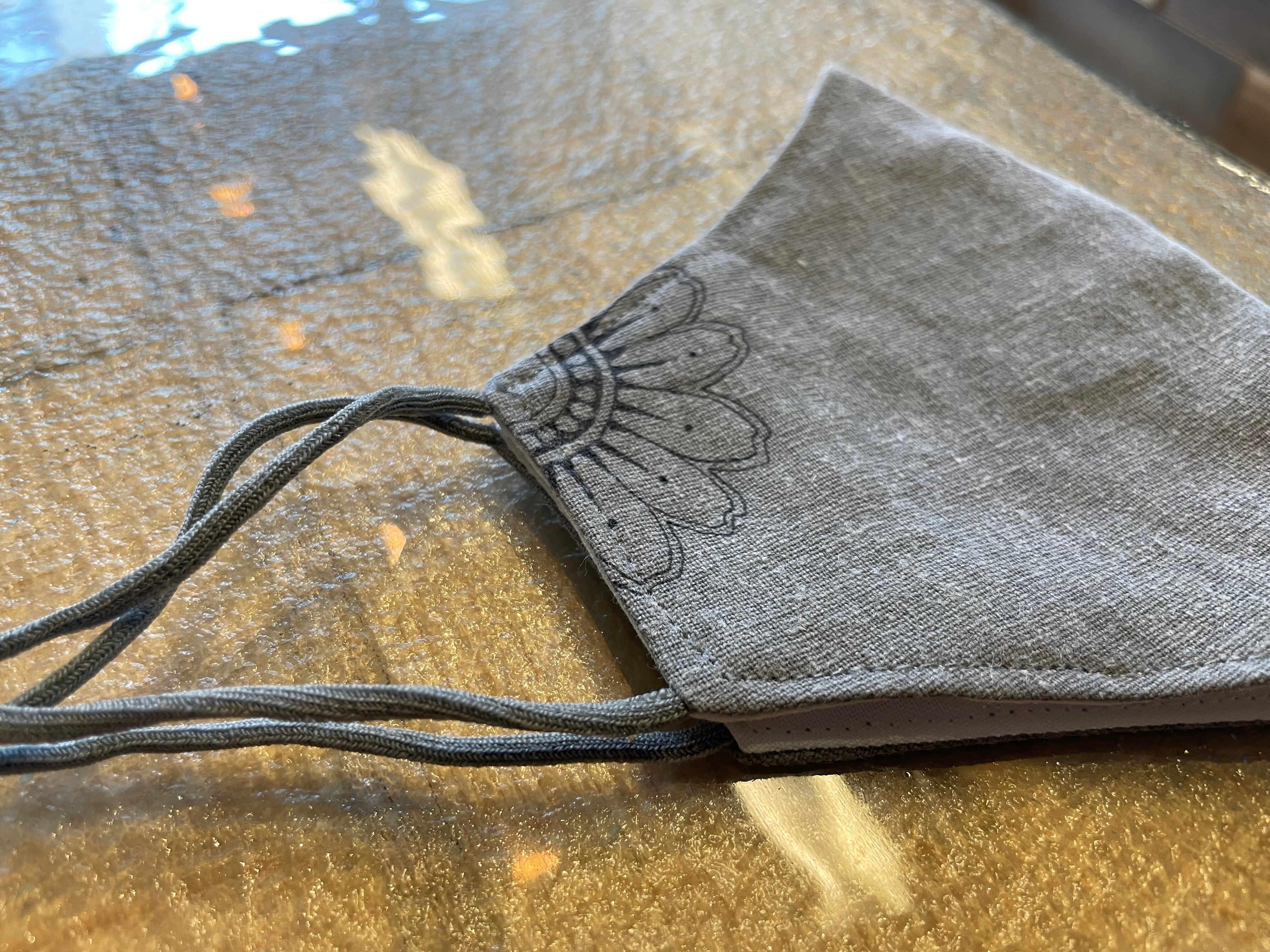 今や生活必需品となった麻素材の”マスク”に、黒の油性マーカーでデザインしました。大人用標準サイズ(約10.5×13.5㎝)で色はグレー、銀イオンAg+加工のマスクです。洗って複数回の使用が可能です。