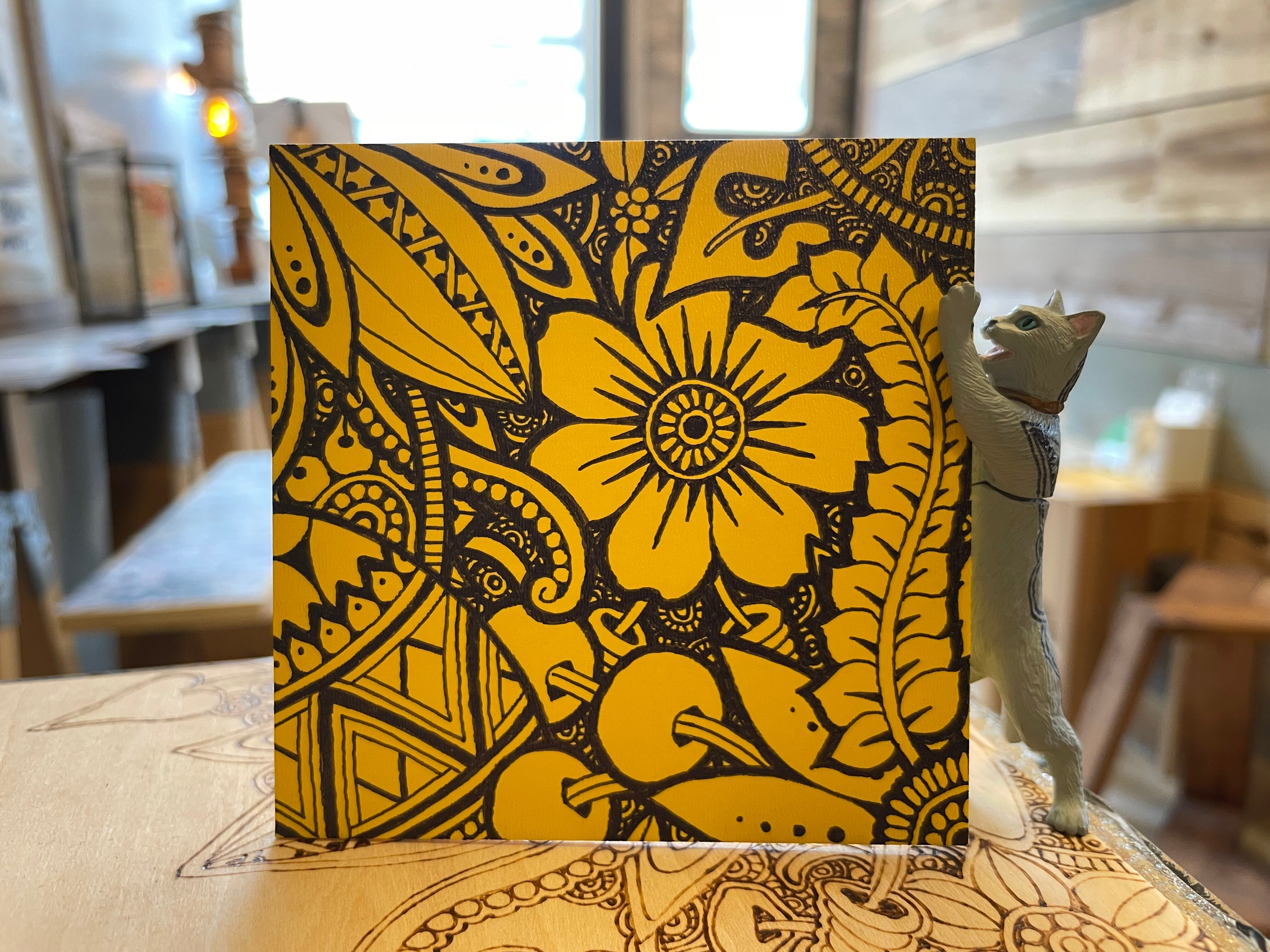 耐熱性、耐水性の特殊紙PASCOに、マッキーを使用して下描きなしの1発勝負で描いたデザインコースターです。今回のテーマは〝黄×黒〟です。これまでの作品とは異なり、縁を黒く塗り潰している珍しく作品です。同封している滑り止めを付けてコースターとして使っても良し、そのまま額などに入れて作品として飾るのも良いです。