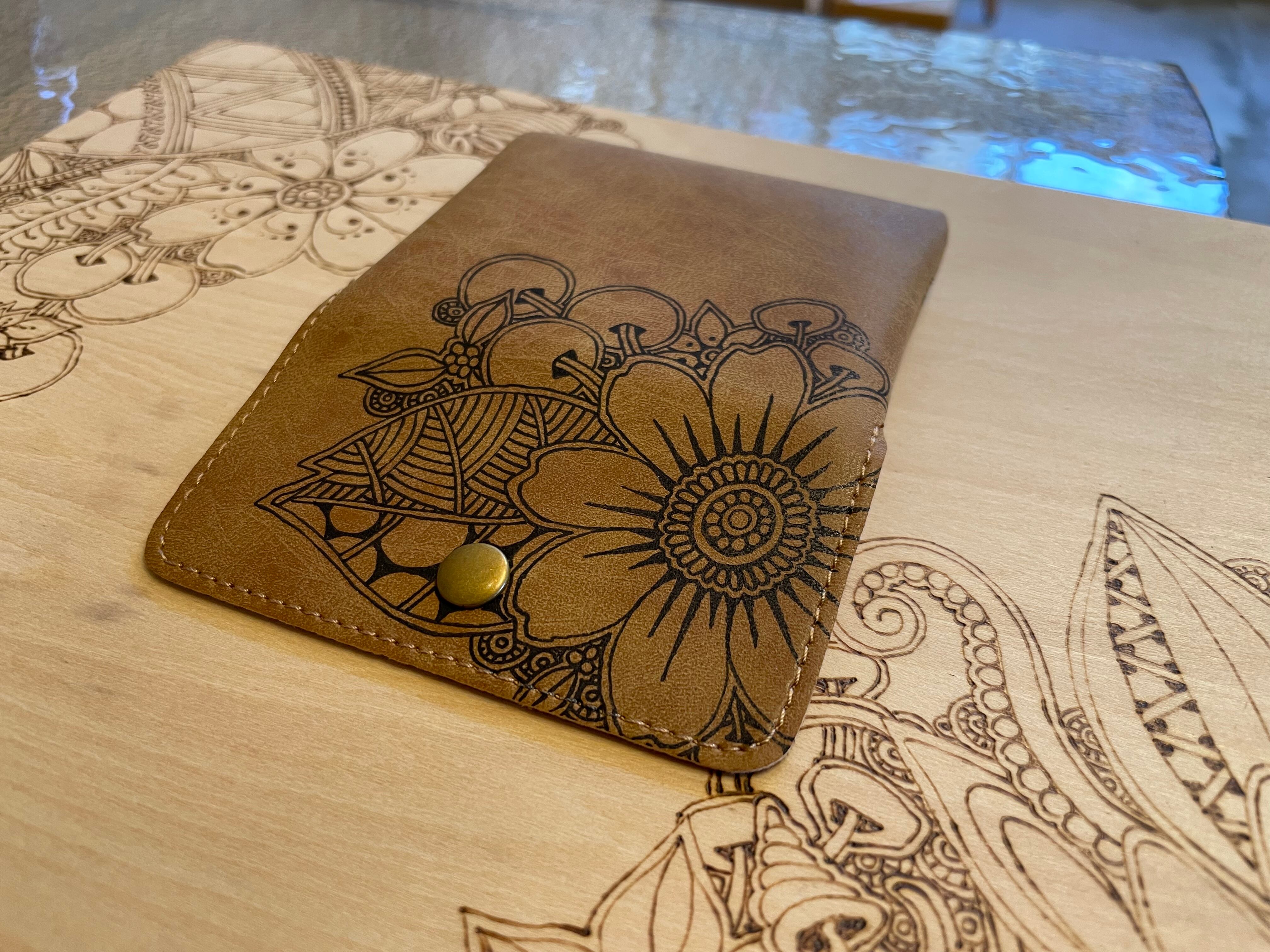レザー調の茶色いコインケースに、デザインを描きました。10㎝×8㎝でポケットなどにも入り易いです。蓋を開けるとデザインが繋がってか