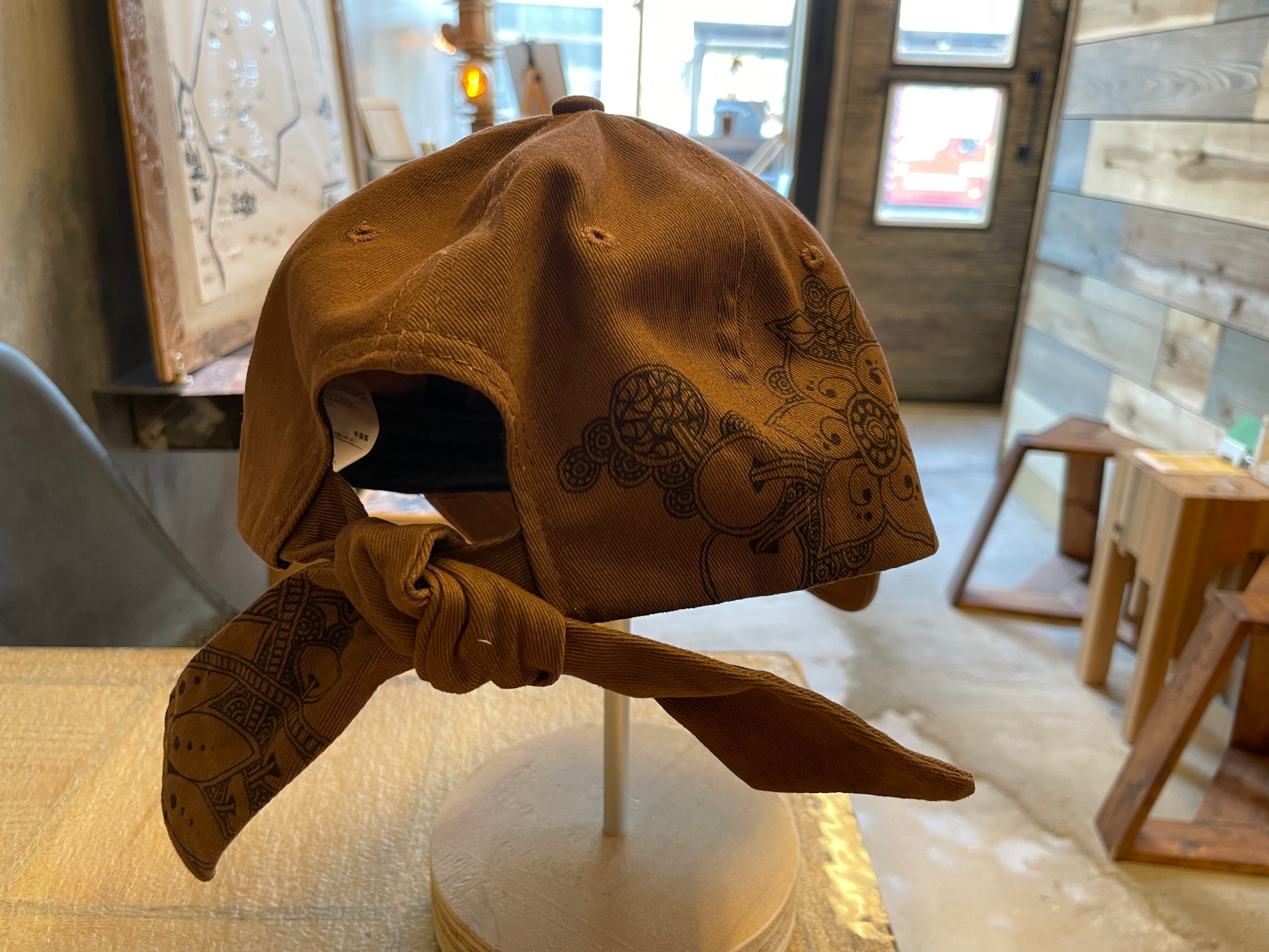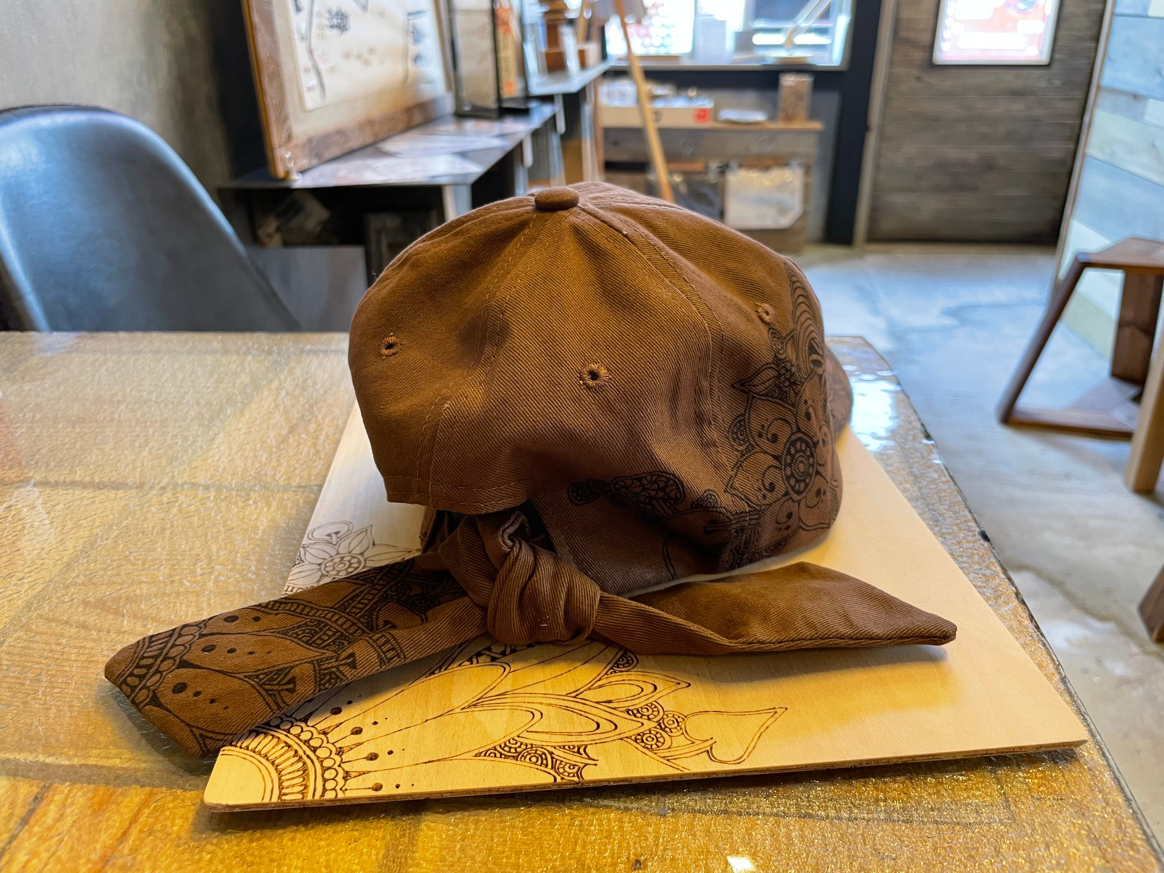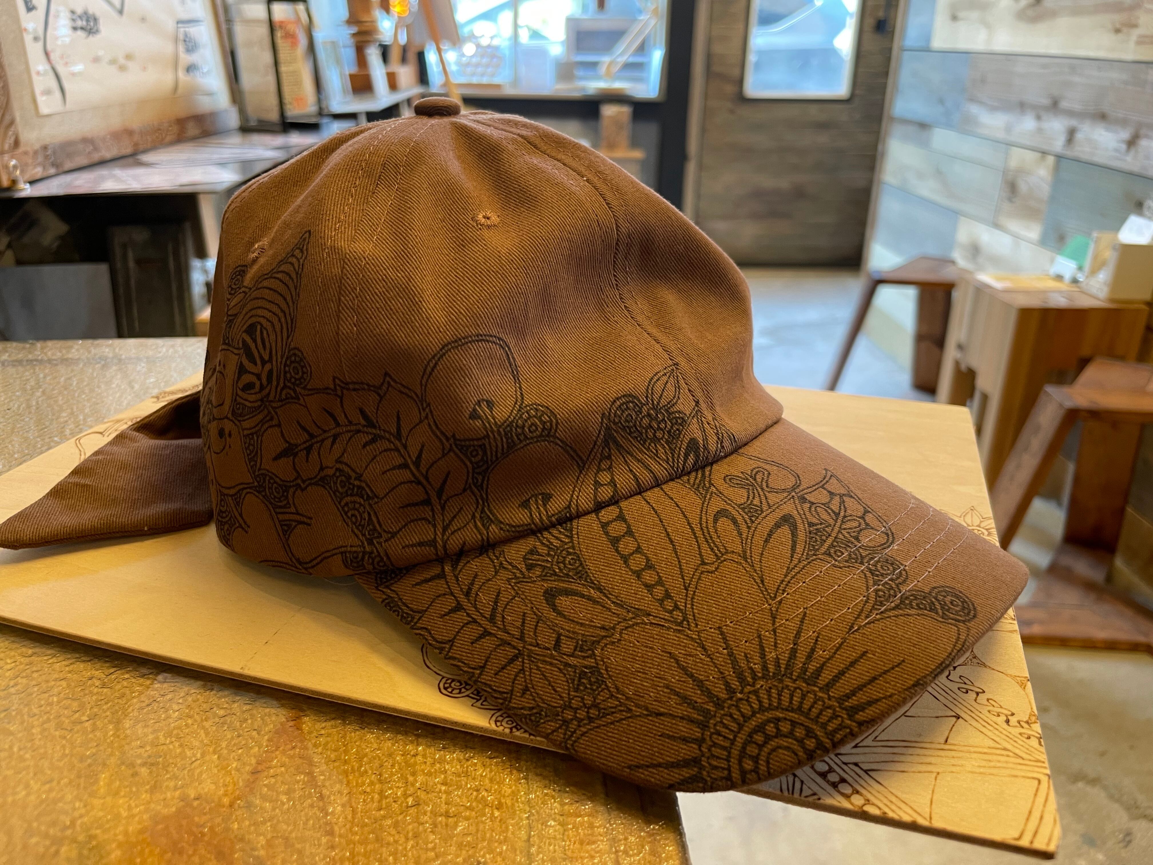 茶色のバックリボンキャップの右半分と、リボンの一部に、黒の油性マーカーで大きなタングルデザインをしました。材質は綿100%、頭周りは56㎝です。