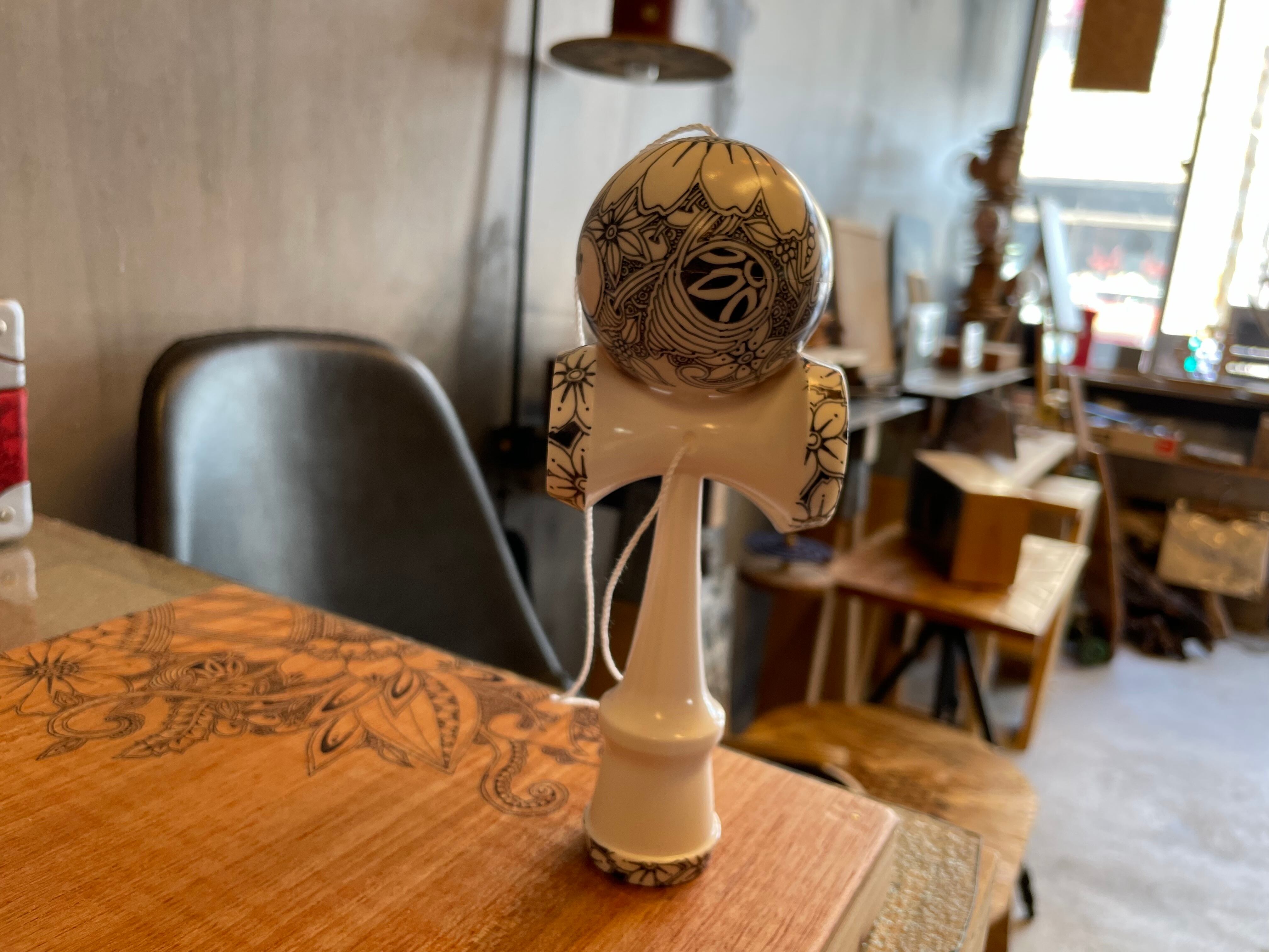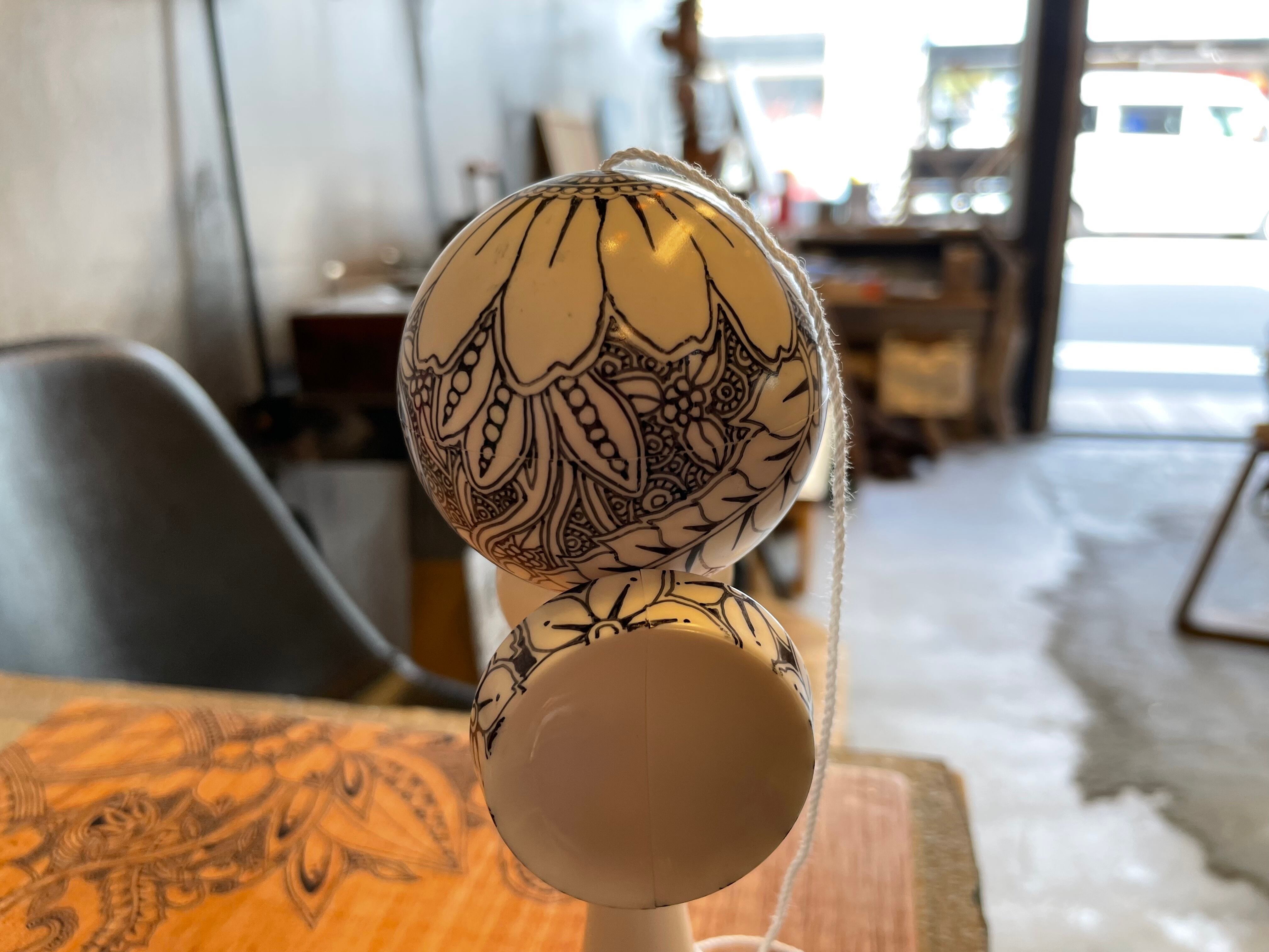 昔懐かしの玩具”けん玉(白)”の、玉の部分と持ち手の一部を、黒マッキーでデザインした珍しいものです。球体にデザインをするのはとても難しいのですが、初代・2代目作品が売切れとなった後にも更に要望が多かったので、3代目デザインを描きました。このシリーズは、最初に目をつけてくださった方に敬意を表し、代を追うごとに値段を上げています。
